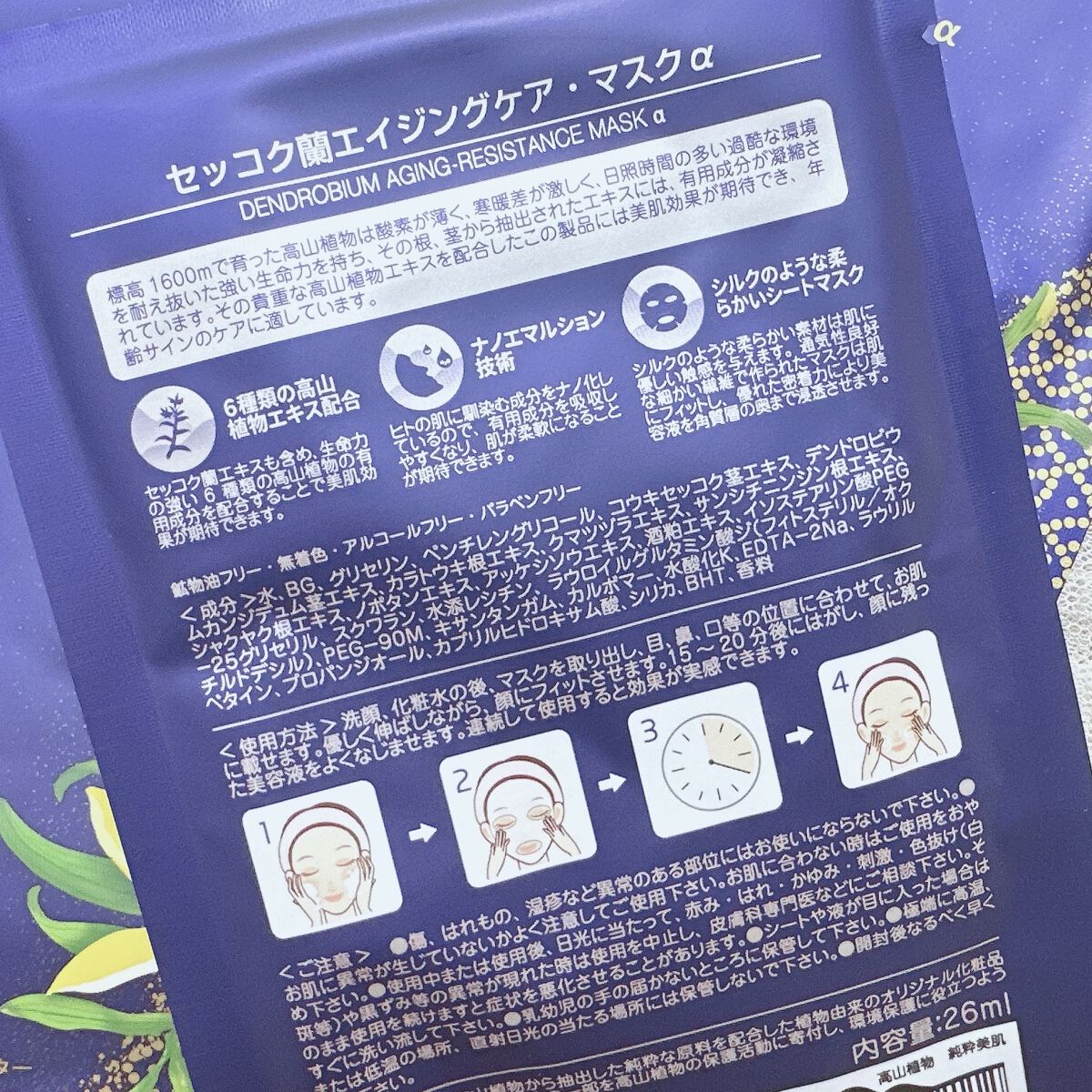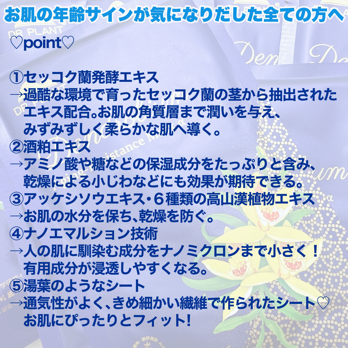 - 肌の年齢サインが気になりだした全ての⼥性に。⾼⼭植物、セッコク蘭*の⽣命⼒パワーたっぷりの保湿・美肌ケアできるフェイスマスクです。使⽤後、肌が柔らかくなり、夜使⽤することで翌朝ふっくら&しっとり。空気の澄んだ、寒暖の激しい過酷な地域で育った⽣命⼒あふれるセッコク蘭*にこだわり、DR PLANTが所有する標⾼1,600メートル以上の農園に⾃⽣するものだけをエキスに抽出し、フェイスマスクの美容成分として⼊れています。シートはシルクのような柔らかい素材で、通気性良好な細かい繊維が優れた密着⼒により美容液を⾓質層のすみずみまで浸透させます。防腐剤を極⼒少なくするため、滅菌処理で1枚1枚丁寧に梱包されています。 *セッコク蘭とは、古代中国では万能草と信じられていた蘭科の⾼⼭植物で、古来中国の⼈々は貴重なセッコク蘭を求め、標⾼の⾼いところまで探しに⾏ったと伝えられています。また、中国の最⾼の贈り物としてセッコク蘭がイギリス⼥王に贈呈されたという逸話が残っています