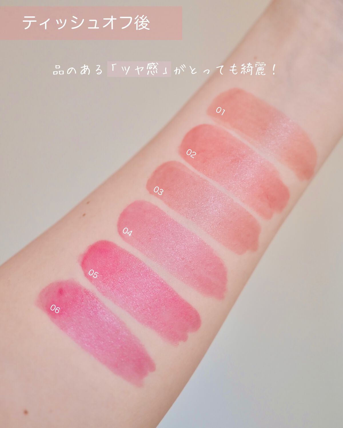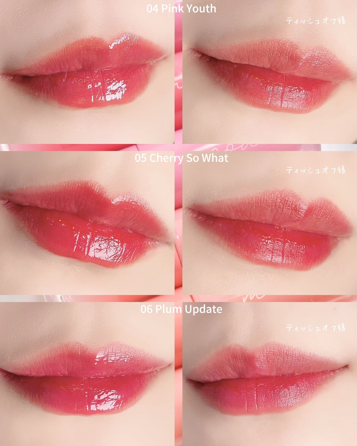 - <01 BEST BEIGE MENU(推し杏子ベージュ)> 水、ジフェニルジメチコン、リンゴ酸ジイソステアリル、ビスジグリセリルボリアシルアジペート-2、水添ポリイソブテン、ダイマー ジリノール酸ダイマージリノレイルビス(ベヘニル/イソステアリル/フィトステリル)、ジグリセリン、セチルPEG/PPG-10/1ジメチコン、DPG、水添ポリ (C6-14 オレフィン)、ポリソルベート60、イソステアリン酸ソルビタン、ダイマージリノール酸ジイソステアリン酸ポリ グリセリル-3、ペンチレングリコール、(アクリル酸ヒドロキシエチル/アクリロイルジメチルタウリンNa)コポリマー、トリ(カプリル酸/ カプリン酸)グリセリル、スクワラン、セテアレス-20、(エチレン/プロピレン)コポリマー、フェノキシエタノール、グリセリン、ポリグリ セリン-3、香料、エチルヘキシルグリセリン、ハマメリス葉エキス、オニユリエキス、BG、酸化チタン、黄5、赤227、赤104(1)、青1 <02 CORAL INFLUENCER(イエベ必須コーラル)> 水、ジフェニルジメチコン、リンゴ酸ジイソステアリル、ビスジグリセリルボリアシルアジペート-2、水添ポリイソブテン、ダイマー ジリノール酸ダイマージリノレイルビス(ベヘニル/イソステアリル/フィトステリル)、ジグリセリン、セチルPEG/PPG-10/1ジメチコン、DPG、水添ポリ (C6-14 オレフィン)、ポリソルベート60、イソステアリン酸ソルビタン、ダイマージリノール酸ジイソステアリン酸ポリ グリセリル-3、ペンチレングリコール、(アクリル酸ヒドロキシエチル/アクリロイルジメチルタウリンNa)コポリマー、トリ(カプリル酸/ カプリン酸)グリセリル、スクワラン、セテアレス-20、(エチレン/プロピレン)コポリマー、フェノキシエタノール、グリセリン、ポリグリ セリン-3、香料、エチルヘキシルグリセリン、ハマメリス葉エキス、オニユリエキス、BG、酸化チタン、黄5、赤227、赤104(1)、青1 <03 ROSE IN MIND(いいねローズ)> 水、ジフェニルジメチコン、リンゴ酸ジイソステアリル、ビスジグリセリルポリアシルアジペート-2、水添ポリイソブテン、ダイマージリノール酸ダイマージリノレイルビス(ベヘニル/イソステアリル/フィトステリル)、ジグリセリン、DPG、セチルPEG/PPG-10/1ジメチコン、水添ポリデセン、ポリソルベート60、イソステアリン酸ソルビタン、ダイマージリノール酸ジイソステアリン酸ポリグリセリル-3、ペンチレングリコール、(アクリル酸ヒドロキシエチル/アクリロイルジメチルタウリンNa)コポリマー、トリ(カプリル酸/カプリン酸)グリセリル、スクワラン、セテアレス-20、(エチレン/プロピレン)コポリマー、フェノキシエタノール、グリセリン、香料、エチルヘキシルグリセリン、ハマメリス葉エキス、オニユリエキス、BG、テトラ(ジ-t-ブチルヒドロキシヒドロケイヒ酸)ペンタエリスリチル、酸化チタン、黄5、赤104(1)、赤227、青1 <04 PINK YOUTH(ベイビー天使)> 水、ジフェニルジメチコン、リンゴ酸ジイソステアリル、ビスジグリセリルボリアシルアジペート-2、水添ポリイソブテン、ダイマー ジリノール酸ダイマージリノレイルビス(ベヘニル/イソステアリル/フィトステリル)、ジグリセリン、セチルPEG/PPG-10/1ジメチコン、DPG、水添ポリ (C6-14オレフィン)、ポリソルベート60、イソステアリン酸ソルビタン、ダイマージリノール酸ジイソステアリン酸ポリ グリセリル-3、ペンチレングリコール、(アクリル酸ヒドロキシエチル/アクリロイルジメチルタウリンNa)コポリマー、トリ(カプリル酸/ カプリン酸)グリセリル、スクワラン、セテアレス-20、(エチレン/プロピレン)コポリマー、フェノキシエタノール、ポリグリセリン-3、香料、エチルヘキシルグリセリン、グリセリン、水酸化Al、ポリアクリル酸アンモニウム、BG、ハマメリス葉エキス、オニユリエキス、酸化チタン、赤227、黄4、赤104 (1) 黄5、青1 <05 CHERRY SO WHAT(どうしたのチェリー)> 水、ジフェニルジメチコン、リンゴ酸ジイソステアリル、ビスジグリセリルポリアシルアジペート-2、水添ポリイソブテン、ダイマージリノール酸ダイマージリノレイルビス(ベヘニル/イソステアリル/フィトステリル)、ジグリセリン、セチルPEG/PPG-10/1ジメチコン、DPG、水添ポリ(C6-14オレフィン)、ポリソルベート60、イソステアリン酸ソルビタン、ダイマージリノール酸ジイソステアリン酸ポリグリセリル-3、ペンチレングリコール、(アクリル酸ヒドロキシエチル/アクリロイルジメチルタウリンNa)コポリマー、トリ(カプリル酸/カプリン酸)グリセリル、スクワラン、セテアレス-20、(エチレン/プロピレン)コポリマー、フェノキシエタノール、ポリグリセリン-3、香料、エチルヘキシルグリセリン、グリセリン、ハマメリス葉エキス、オニユリエキス、BG、赤227、黄4、赤104(1)、黄5、青1 <06 PLUM UPDATE(プロフ写プラム)> 水、ジフェニルジメチコン、リンゴ酸ジイソステアリル、ビスジグリセリルポリアシルアジペート-2、水添ポリイソブテン、ダイマー ジリノール酸ダイマージリノレイルビス(ベヘニル/イソステアリル/フィトステリル)、