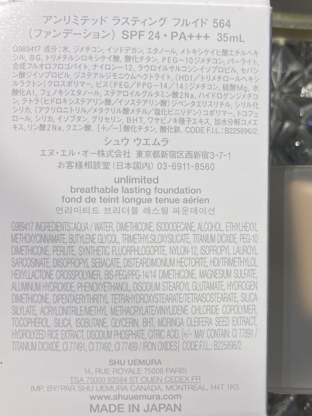 - <375> 水、ジメチコン、イソドデカン、エタノール、メトキシケイヒ酸エチルヘキシル、BG、トリメチルシロキシケイ酸、酸化チタン、PEG-10ジメチコン、パーライト、合成フルオロフロゴバイト、ナイロン-12、ラウロイルサルコシンイソプロピル、セバシン酸ジイソプロピル、ジステアルジモニウムヘクトライト、(HDI/トリメチロールヘキシルラクトン)クロスポリマー、ビス(PEG/PPG-14/14)ジメチコン、硫酸Mg、水酸化AI、フェノキシエタノール、ステアロイルグルタミン酸2Na、ハイドロゲンジメチコン、テトラ(ヒドロキシステアリン酸/イソステアリン酸)ジベンタエリスリチル、シリル化シリカ、(アクリロニトリル/メタクリル酸メチル/塩化ビニリデン) コポリマー、トコフェロール、シリカ、イソブタン、グリセリン、BHT、ワサビノキ種子エキス、加水分解コメエキス、リン酸2Na、クエン酸、〔+/-〕酸化チタン、酸化鉄 <453> 水、ジメチコン、イソドデカン、エタノール、メトキシケイヒ酸エチルヘキシル、BG、トリメチルシロキシケイ酸、酸化チタン、PEG-10ジメチコン、パーライト、合成フルオロフロゴバイト、ナイロン-12、ラウロイルサルコシンイソプロピル、セバシン酸ジイソプロピル、ジステアルジモニウムヘクトライト、(HDI/トリメチロールヘキシルラクトン)クロスポリマー、ビス(PEG/PPG-14/14)ジメチコン、硫酸Mg、水酸化AI、フェノキシエタノール、ステアロイルグルタミン酸2Na、ハイドロゲンジメチコン、テトラ(ヒドロキシステアリン酸/イソステアリン酸)ジベンタエリスリチル、シリル化シリカ、(アクリロニトリル/メタクリル酸メチル/塩化ビニリデン) コポリマー、トコフェロール、シリカ、イソブタン、グリセリン、BHT、ワサビノキ種子エキス、加水分解コメエキス、リン酸2Na、クエン酸、〔+/-〕酸化チタン、酸化鉄 <463> 水、ジメチコン、イソドデカン、エタノール、メトキシケイヒ酸エチルヘキシル、BG、トリメチルシロキシケイ酸、酸化チタン、PEG-10ジメチコン、パーライト、合成フルオロフロゴバイト、ナイロン-12、ラウロイルサルコシンイソプロピル、セバシン酸ジイソプロピル、ジステアルジモニウムヘクトライト、(HDI/トリメチロールヘキシルラクトン)クロスポリマー、ビス(PEG/PPG-14/14)ジメチコン、硫酸Mg、水酸化AI、フェノキシエタノール、ステアロイルグルタミン酸2Na、ハイドロゲンジメチコン、テトラ(ヒドロキシステアリン酸/イソステアリン酸)ジベンタエリスリチル、シリル化シリカ、(アクリロニトリル/メタクリル酸メチル/塩化ビニリデン) コポリマー、トコフェロール、シリカ、イソブタン、グリセリン、BHT、ワサビノキ種子エキス、加水分解コメエキス、リン酸2Na、クエン酸、〔+/-〕酸化チタン、酸化鉄 <474> 水、ジメチコン、イソドデカン、エタノール、メトキシケイヒ酸エチルヘキシル、BG、トリメチルシロキシケイ酸、酸化チタン、PEG-10ジメチコン、パーライト、合成フルオロフロゴバイト、ナイロン-12、ラウロイルサルコシンイソプロピル、セバシン酸ジイソプロピル、ジステアルジモニウムヘクトライト、(HDI/トリメチロールヘキシルラクトン)クロスポリマー、ビス(PEG/PPG-14/14)ジメチコン、硫酸Mg、水酸化AI、フェノキシエタノール、ステアロイルグルタミン酸2Na、ハイドロゲンジメチコン、テトラ(ヒドロキシステアリン酸/イソステアリン酸)ジベンタエリスリチル、シリル化シリカ、(アクリロニトリル/メタクリル酸メチル/塩化ビニリデン) コポリマー、トコフェロール、シリカ、イソブタン、グリセリン、BHT、ワサビノキ種子エキス、加水分解コメエキス、リン酸2Na、クエン酸、〔+/-〕酸化チタン、酸化鉄 <484> 水、ジメチコン、イソドデカン、エタノール、メトキシケイヒ酸エチルヘキシル、BG、トリメチルシロキシケイ酸、酸化チタン、PEG-10ジメチコン、パーライト、合成フルオロフロゴバイト、ナイロン-12、ラウロイルサルコシンイソプロピル、セバシン酸ジイソプロピル、ジステアルジモニウムヘクトライト、(HDI/トリメチロールヘキシルラクトン)クロスポリマー、ビス(PEG/PPG-14/14)ジメチコン、硫酸Mg、水酸化AI、フェノキシエタノール、ステアロイルグルタミン酸2Na、ハイドロゲンジメチコン、テトラ(ヒドロキシステアリン酸/イソステアリン酸)ジベンタエリスリチル、シリル化シリカ、(アクリロニトリル/メタクリル酸メチル/塩化ビニリデン) コポリマー、トコフェロール、シリカ、イソブタン、グリセリン、BHT、ワサビノキ種子エキス、加水分解コメエキス、リン酸2Na、クエン酸、〔+/-〕酸化チタン、酸化鉄 <534> 水、ジメチコン、イソドデカン、エタノール、メトキシケイヒ酸エチルヘキシル、BG、トリメチルシロキシケイ酸、酸化チタン、PEG-10ジメチコン、パーライト、合成フルオロフロゴバイト、ナイロン-12、ラウロイルサルコシンイソプロピル、セバシン酸ジイソプロピル、ジステアルジモニウムヘクトライト、(HDI/トリメチロールヘキシルラクトン)クロスポリマー、ビス(PEG/PPG