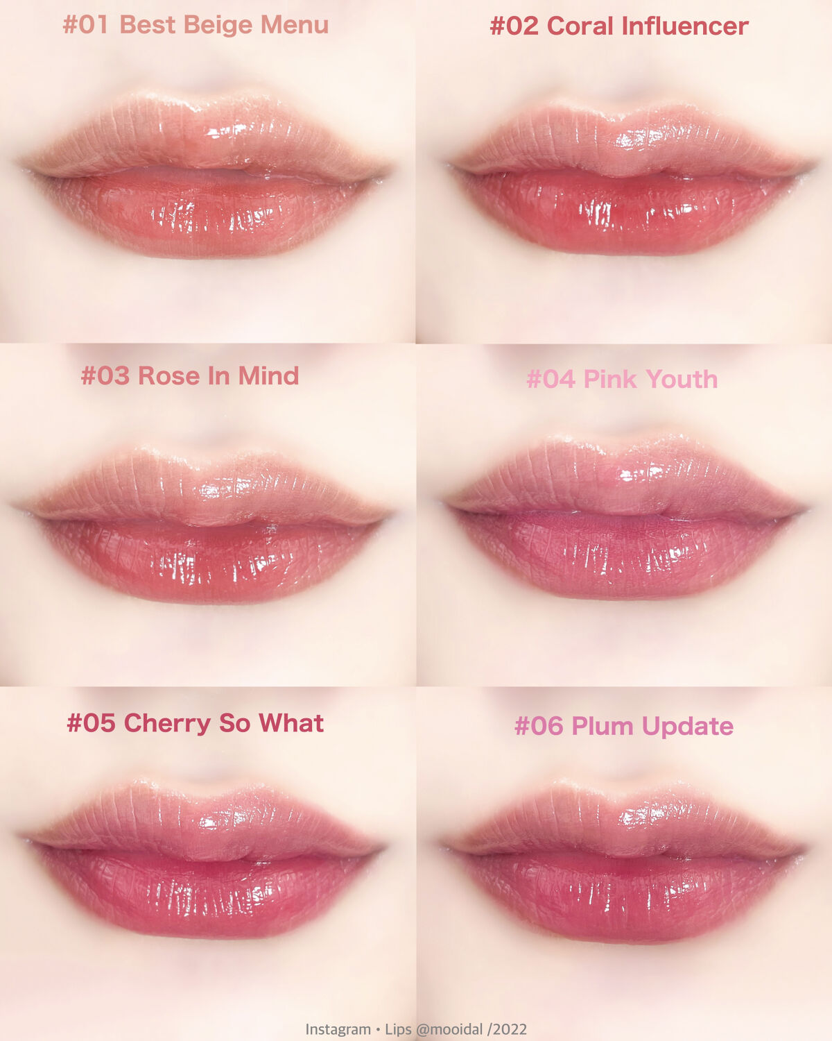 - <01 BEST BEIGE MENU(推し杏子ベージュ)> 水、ジフェニルジメチコン、リンゴ酸ジイソステアリル、ビスジグリセリルボリアシルアジペート-2、水添ポリイソブテン、ダイマー ジリノール酸ダイマージリノレイルビス(ベヘニル/イソステアリル/フィトステリル)、ジグリセリン、セチルPEG/PPG-10/1ジメチコン、DPG、水添ポリ (C6-14 オレフィン)、ポリソルベート60、イソステアリン酸ソルビタン、ダイマージリノール酸ジイソステアリン酸ポリ グリセリル-3、ペンチレングリコール、(アクリル酸ヒドロキシエチル/アクリロイルジメチルタウリンNa)コポリマー、トリ(カプリル酸/ カプリン酸)グリセリル、スクワラン、セテアレス-20、(エチレン/プロピレン)コポリマー、フェノキシエタノール、グリセリン、ポリグリ セリン-3、香料、エチルヘキシルグリセリン、ハマメリス葉エキス、オニユリエキス、BG、酸化チタン、黄5、赤227、赤104(1)、青1 <02 CORAL INFLUENCER(イエベ必須コーラル)> 水、ジフェニルジメチコン、リンゴ酸ジイソステアリル、ビスジグリセリルボリアシルアジペート-2、水添ポリイソブテン、ダイマー ジリノール酸ダイマージリノレイルビス(ベヘニル/イソステアリル/フィトステリル)、ジグリセリン、セチルPEG/PPG-10/1ジメチコン、DPG、水添ポリ (C6-14 オレフィン)、ポリソルベート60、イソステアリン酸ソルビタン、ダイマージリノール酸ジイソステアリン酸ポリ グリセリル-3、ペンチレングリコール、(アクリル酸ヒドロキシエチル/アクリロイルジメチルタウリンNa)コポリマー、トリ(カプリル酸/ カプリン酸)グリセリル、スクワラン、セテアレス-20、(エチレン/プロピレン)コポリマー、フェノキシエタノール、グリセリン、ポリグリ セリン-3、香料、エチルヘキシルグリセリン、ハマメリス葉エキス、オニユリエキス、BG、酸化チタン、黄5、赤227、赤104(1)、青1 <03 ROSE IN MIND(いいねローズ)> 水、ジフェニルジメチコン、リンゴ酸ジイソステアリル、ビスジグリセリルポリアシルアジペート-2、水添ポリイソブテン、ダイマージリノール酸ダイマージリノレイルビス(ベヘニル/イソステアリル/フィトステリル)、ジグリセリン、DPG、セチルPEG/PPG-10/1ジメチコン、水添ポリデセン、ポリソルベート60、イソステアリン酸ソルビタン、ダイマージリノール酸ジイソステアリン酸ポリグリセリル-3、ペンチレングリコール、(アクリル酸ヒドロキシエチル/アクリロイルジメチルタウリンNa)コポリマー、トリ(カプリル酸/カプリン酸)グリセリル、スクワラン、セテアレス-20、(エチレン/プロピレン)コポリマー、フェノキシエタノール、グリセリン、香料、エチルヘキシルグリセリン、ハマメリス葉エキス、オニユリエキス、BG、テトラ(ジ-t-ブチルヒドロキシヒドロケイヒ酸)ペンタエリスリチル、酸化チタン、黄5、赤104(1)、赤227、青1 <04 PINK YOUTH(ベイビー天使)> 水、ジフェニルジメチコン、リンゴ酸ジイソステアリル、ビスジグリセリルボリアシルアジペート-2、水添ポリイソブテン、ダイマー ジリノール酸ダイマージリノレイルビス(ベヘニル/イソステアリル/フィトステリル)、ジグリセリン、セチルPEG/PPG-10/1ジメチコン、DPG、水添ポリ (C6-14オレフィン)、ポリソルベート60、イソステアリン酸ソルビタン、ダイマージリノール酸ジイソステアリン酸ポリ グリセリル-3、ペンチレングリコール、(アクリル酸ヒドロキシエチル/アクリロイルジメチルタウリンNa)コポリマー、トリ(カプリル酸/ カプリン酸)グリセリル、スクワラン、セテアレス-20、(エチレン/プロピレン)コポリマー、フェノキシエタノール、ポリグリセリン-3、香料、エチルヘキシルグリセリン、グリセリン、水酸化Al、ポリアクリル酸アンモニウム、BG、ハマメリス葉エキス、オニユリエキス、酸化チタン、赤227、黄4、赤104 (1) 黄5、青1 <05 CHERRY SO WHAT(どうしたのチェリー)> 水、ジフェニルジメチコン、リンゴ酸ジイソステアリル、ビスジグリセリルポリアシルアジペート-2、水添ポリイソブテン、ダイマージリノール酸ダイマージリノレイルビス(ベヘニル/イソステアリル/フィトステリル)、ジグリセリン、セチルPEG/PPG-10/1ジメチコン、DPG、水添ポリ(C6-14オレフィン)、ポリソルベート60、イソステアリン酸ソルビタン、ダイマージリノール酸ジイソステアリン酸ポリグリセリル-3、ペンチレングリコール、(アクリル酸ヒドロキシエチル/アクリロイルジメチルタウリンNa)コポリマー、トリ(カプリル酸/カプリン酸)グリセリル、スクワラン、セテアレス-20、(エチレン/プロピレン)コポリマー、フェノキシエタノール、ポリグリセリン-3、香料、エチルヘキシルグリセリン、グリセリン、ハマメリス葉エキス、オニユリエキス、BG、赤227、黄4、赤104(1)、黄5、青1 <06 PLUM UPDATE(プロフ写プラム)> 水、ジフェニルジメチコン、リンゴ酸ジイソステアリル、ビスジグリセリルポリアシルアジペート-2、水添ポリイソブテン、ダイマー ジリノール酸ダイマージリノレイルビス(ベヘニル/イソステアリル/フィトステリル)、