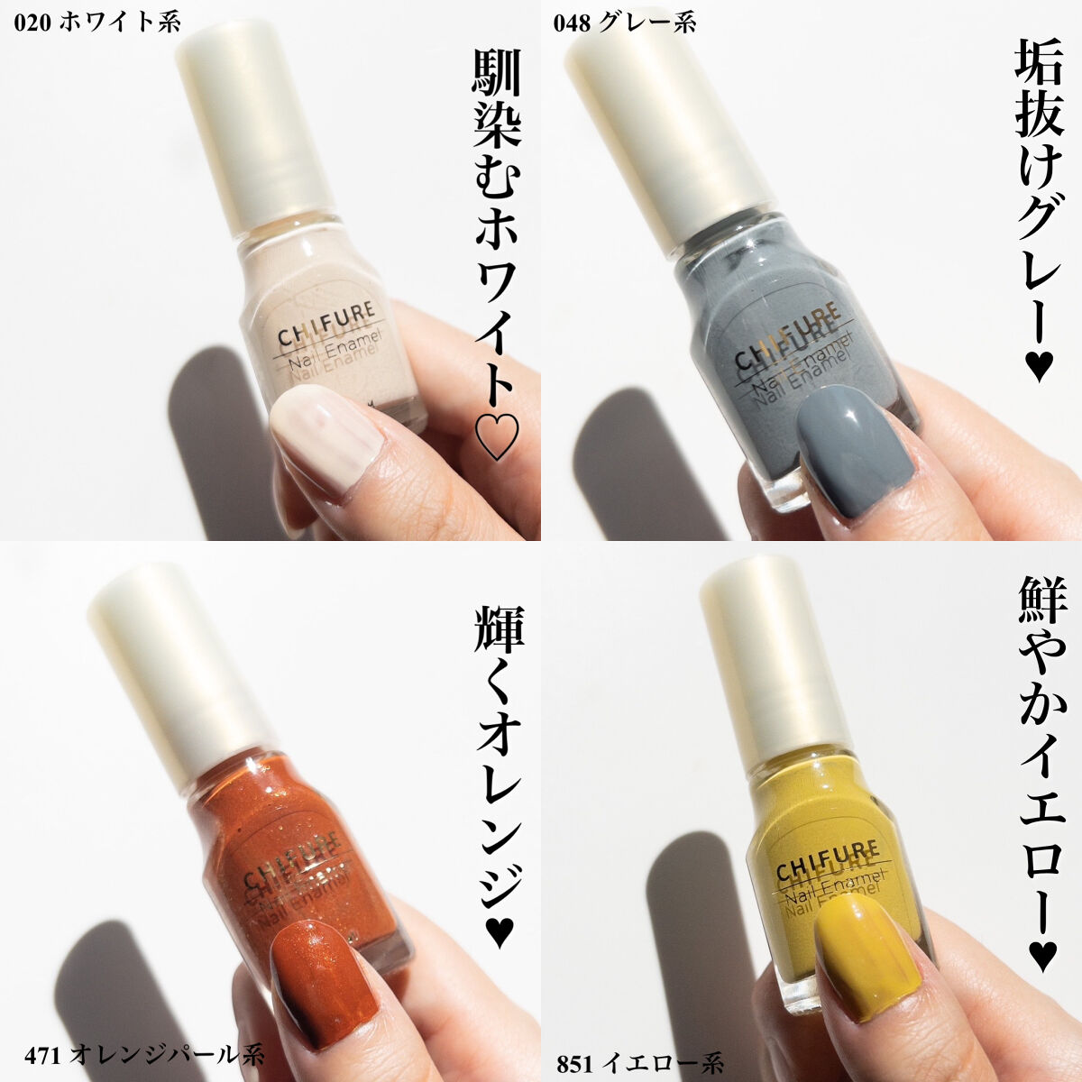- 豊富なラインナップ全53色!つけたての仕上がりが長く続く、速乾タイプのネイルエナメル。 速乾性にすぐれ、つけたての仕上がりが長持ちするネイルエナメルです。なめらかにのびてムラになりにくく、ぬりやすい平筆タイプ。 豊富な色揃えで、トレンドの色からベーシックな色まで、なりたい指先に合わせて選べます。 保湿成分:パンテノール 配合 無香料・オキシベンゾンフリー・トルエンフリー 【使用方法】 ・よく振ってから、適量を筆にとります。 ・爪の中央をぬったあと、両端をぬります。 ・爪の甘皮部分、両端は1mm程度空けてぬるようにすると、除光液で落としやすくなります。 ・ぬる前に「ちふれ ベースコート」をお使いいただくと、均一にぬれて、さらに発色がよくなります。 ・仕上げに「ちふれ トップコート」や「ちふれ マット トップコート」をお使いいただくと、美しい仕上がりが長持ちします。 (※2024年5月以降、一部カラー順次商品成分リニューアル。尚これにかかる商品の返品・交換等は承っておりません。)