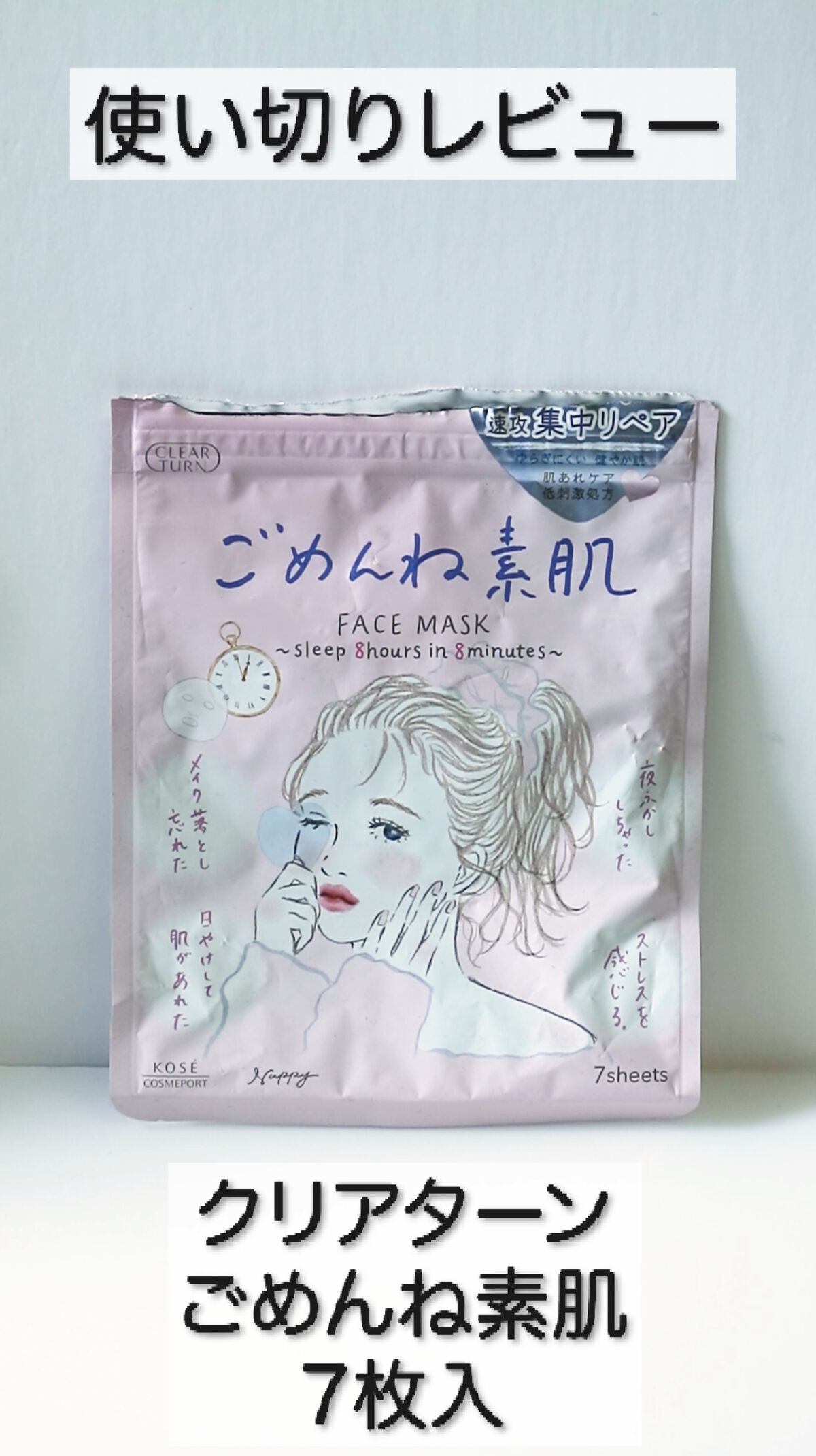 - 【クリアターン ごめんね素肌マスク】 負担をかけて、あれてしまった肌の素肌環境※1をととのえる“速攻集中リペア※2マスク”です。 ① あれがちな肌を素早くコンディションケア! ザクロエキス、桜エキス※3、ウメ果実エキスBG配合し、ゆらぎやすい肌環境をととのえ、肌あれをケアします。また、うるおいケア成分として、ヒアルロン酸、白キクラゲ多糖体BGを配合。外的ストレス※4や不規則な生活の影響を受けやすい肌も健やかでゆらぎにくい肌へみちびきます。 ②敏感肌も使える、弱酸性・低刺激処方 無香料・無着色・無鉱物油・アルコールフリー(エチルアルコール)・パラベンフリー・紫外線吸収剤フリー・シリコーンフリー・パッチテスト済み・アレルギーテスト済み・スティンギングテスト済み・敏感肌自覚者による連用テスト済み(すべての方にアレルギーや皮膚刺激が起きない、刺激感がないというわけではありません。すべての方の肌に合うということではありません。) ③角質ケアもできる!凸凹高密着シート コットン生まれのやわらかな肌触りのベンリーゼを使用。 表面に凸凹のエンボス加工を施しているため、密着性が高く、はがしたマスクでやさしく顔をふきとることで角質ケアもできます。 ※1 うるおい環境のこと ※2 うるおいお手入れのこと ※3 ソメイヨシノ葉エキス、ウメ果実エキスBGはウメ果実エキス・BG(保湿) ※4 乾燥による刺激のこと