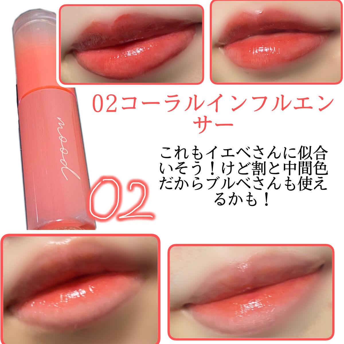 - <01 BEST BEIGE MENU(推し杏子ベージュ)> 水、ジフェニルジメチコン、リンゴ酸ジイソステアリル、ビスジグリセリルボリアシルアジペート-2、水添ポリイソブテン、ダイマー ジリノール酸ダイマージリノレイルビス(ベヘニル/イソステアリル/フィトステリル)、ジグリセリン、セチルPEG/PPG-10/1ジメチコン、DPG、水添ポリ (C6-14 オレフィン)、ポリソルベート60、イソステアリン酸ソルビタン、ダイマージリノール酸ジイソステアリン酸ポリ グリセリル-3、ペンチレングリコール、(アクリル酸ヒドロキシエチル/アクリロイルジメチルタウリンNa)コポリマー、トリ(カプリル酸/ カプリン酸)グリセリル、スクワラン、セテアレス-20、(エチレン/プロピレン)コポリマー、フェノキシエタノール、グリセリン、ポリグリ セリン-3、香料、エチルヘキシルグリセリン、ハマメリス葉エキス、オニユリエキス、BG、酸化チタン、黄5、赤227、赤104(1)、青1 <02 CORAL INFLUENCER(イエベ必須コーラル)> 水、ジフェニルジメチコン、リンゴ酸ジイソステアリル、ビスジグリセリルボリアシルアジペート-2、水添ポリイソブテン、ダイマー ジリノール酸ダイマージリノレイルビス(ベヘニル/イソステアリル/フィトステリル)、ジグリセリン、セチルPEG/PPG-10/1ジメチコン、DPG、水添ポリ (C6-14 オレフィン)、ポリソルベート60、イソステアリン酸ソルビタン、ダイマージリノール酸ジイソステアリン酸ポリ グリセリル-3、ペンチレングリコール、(アクリル酸ヒドロキシエチル/アクリロイルジメチルタウリンNa)コポリマー、トリ(カプリル酸/ カプリン酸)グリセリル、スクワラン、セテアレス-20、(エチレン/プロピレン)コポリマー、フェノキシエタノール、グリセリン、ポリグリ セリン-3、香料、エチルヘキシルグリセリン、ハマメリス葉エキス、オニユリエキス、BG、酸化チタン、黄5、赤227、赤104(1)、青1 <03 ROSE IN MIND(いいねローズ)> 水、ジフェニルジメチコン、リンゴ酸ジイソステアリル、ビスジグリセリルポリアシルアジペート-2、水添ポリイソブテン、ダイマージリノール酸ダイマージリノレイルビス(ベヘニル/イソステアリル/フィトステリル)、ジグリセリン、DPG、セチルPEG/PPG-10/1ジメチコン、水添ポリデセン、ポリソルベート60、イソステアリン酸ソルビタン、ダイマージリノール酸ジイソステアリン酸ポリグリセリル-3、ペンチレングリコール、(アクリル酸ヒドロキシエチル/アクリロイルジメチルタウリンNa)コポリマー、トリ(カプリル酸/カプリン酸)グリセリル、スクワラン、セテアレス-20、(エチレン/プロピレン)コポリマー、フェノキシエタノール、グリセリン、香料、エチルヘキシルグリセリン、ハマメリス葉エキス、オニユリエキス、BG、テトラ(ジ-t-ブチルヒドロキシヒドロケイヒ酸)ペンタエリスリチル、酸化チタン、黄5、赤104(1)、赤227、青1 <04 PINK YOUTH(ベイビー天使)> 水、ジフェニルジメチコン、リンゴ酸ジイソステアリル、ビスジグリセリルボリアシルアジペート-2、水添ポリイソブテン、ダイマー ジリノール酸ダイマージリノレイルビス(ベヘニル/イソステアリル/フィトステリル)、ジグリセリン、セチルPEG/PPG-10/1ジメチコン、DPG、水添ポリ (C6-14オレフィン)、ポリソルベート60、イソステアリン酸ソルビタン、ダイマージリノール酸ジイソステアリン酸ポリ グリセリル-3、ペンチレングリコール、(アクリル酸ヒドロキシエチル/アクリロイルジメチルタウリンNa)コポリマー、トリ(カプリル酸/ カプリン酸)グリセリル、スクワラン、セテアレス-20、(エチレン/プロピレン)コポリマー、フェノキシエタノール、ポリグリセリン-3、香料、エチルヘキシルグリセリン、グリセリン、水酸化Al、ポリアクリル酸アンモニウム、BG、ハマメリス葉エキス、オニユリエキス、酸化チタン、赤227、黄4、赤104 (1) 黄5、青1 <05 CHERRY SO WHAT(どうしたのチェリー)> 水、ジフェニルジメチコン、リンゴ酸ジイソステアリル、ビスジグリセリルポリアシルアジペート-2、水添ポリイソブテン、ダイマージリノール酸ダイマージリノレイルビス(ベヘニル/イソステアリル/フィトステリル)、ジグリセリン、セチルPEG/PPG-10/1ジメチコン、DPG、水添ポリ(C6-14オレフィン)、ポリソルベート60、イソステアリン酸ソルビタン、ダイマージリノール酸ジイソステアリン酸ポリグリセリル-3、ペンチレングリコール、(アクリル酸ヒドロキシエチル/アクリロイルジメチルタウリンNa)コポリマー、トリ(カプリル酸/カプリン酸)グリセリル、スクワラン、セテアレス-20、(エチレン/プロピレン)コポリマー、フェノキシエタノール、ポリグリセリン-3、香料、エチルヘキシルグリセリン、グリセリン、ハマメリス葉エキス、オニユリエキス、BG、赤227、黄4、赤104(1)、黄5、青1 <06 PLUM UPDATE(プロフ写プラム)> 水、ジフェニルジメチコン、リンゴ酸ジイソステアリル、ビスジグリセリルポリアシルアジペート-2、水添ポリイソブテン、ダイマー ジリノール酸ダイマージリノレイルビス(ベヘニル/イソステアリル/フィトステリル)、