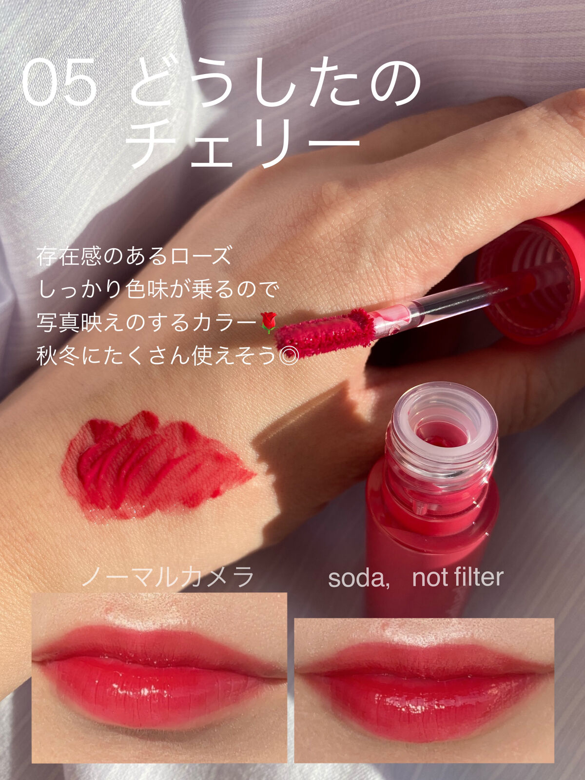 - 爽やかなムードで染まる清楚なツヤティント ツヤ感のある光沢仕上げで、華やかな唇を演出するリップティント。 うるおいを与えながらほんのり色づき、清楚で可憐なツヤリップを演出。 <【ハート盛り】シリーズ共通> ハートモチーフをあしらったキュートなパッケージにもテンションが上がります。 <03 ローズ イン マインド(いいねローズ)【ハート盛り】> イチジクに似たローズ <05 CHERRY SO WHAT(どうしたのチェリー)【ハート盛り】> クールトーンチェリーレッド <20 BROWN YAKGWA(甘いブラウン)【ハート盛り】> しっとりツヤめくチリブリック <22 PINK PRIZE(ローズ7)【ハート盛り】> ブルベすぎないクールロージーカラー <35 SPECIAL CORAL(コーラル特講)【ハート盛り】> コーラルにピンクをちょっぴり <36 PINK TEACHER(クールピンク講師)【ハート盛り】> クールトーン推しライラックピンク 【さつまいもコレクション】 <40 はちみつピンク(DALDAL PINK)(限定)> はちみつさつまいも~甘いはちみつさつまいも~糖度ぎっしり、甘々の淡いピンク <41 おさつピンク(PINK SPIRIT)(限定)> 収穫ほやほやの新鮮なおさつありますよ!おさつにミュートを1滴、くすみピンクカラー <42 とれたてピンク(MONTHLY PINK)(限定)> ピンクは今が食べ頃だよ?ちょうどよく熟した、旬のモーブピンクカラー