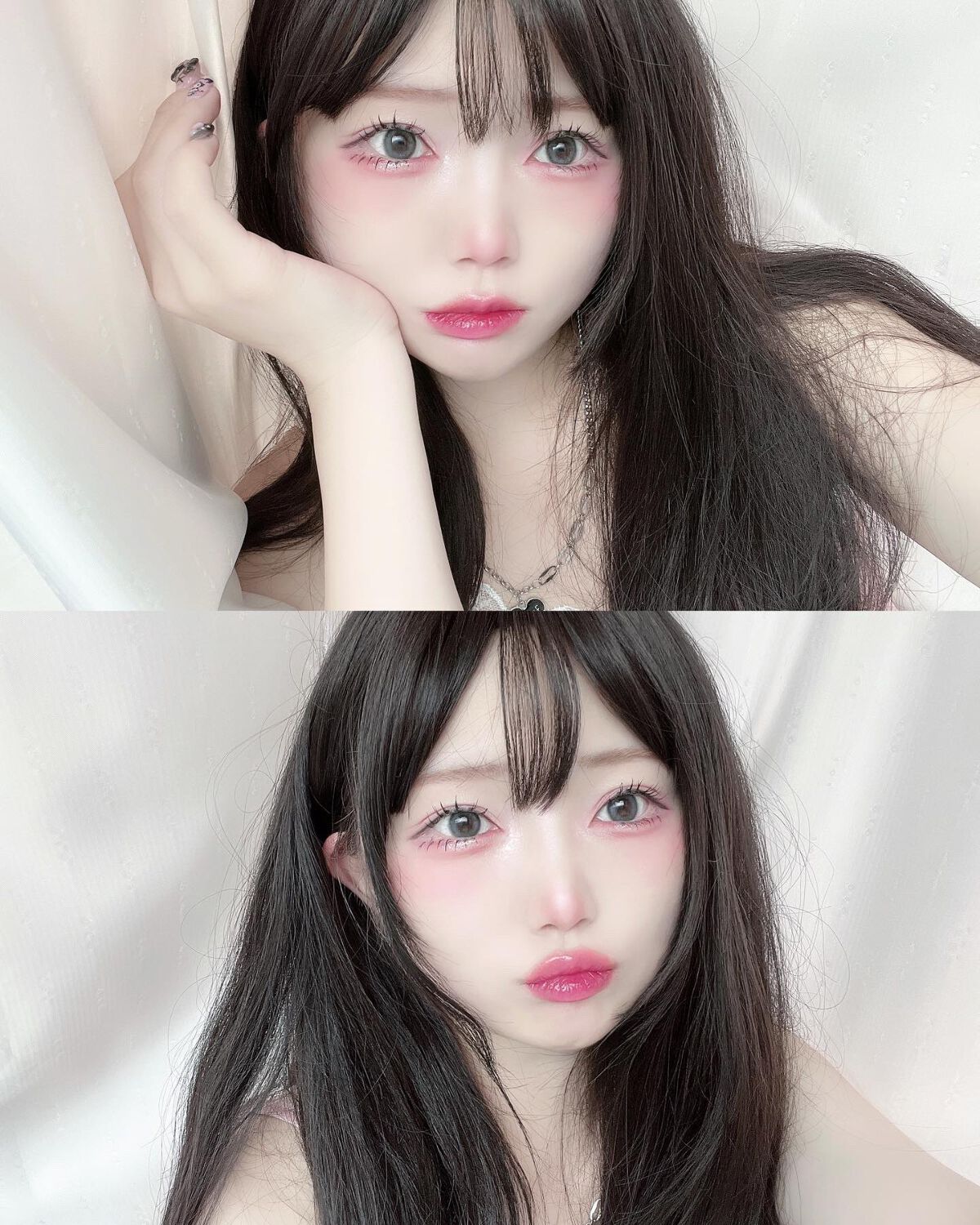 少女っぽいあどけない可愛さ+艶感のある大人っぽい色気をどっちも合わせた純欲メイク✨ 丸みとか下まぶた重心の少女っぽい童顔な感じ?と ハイライトとかラメをたっくさんのせてツヤツヤかつ 上気した感じのほっぺ、ぽてっと唇、眉毛ちょっと濃いめ が、純欲メイクの特徴かな☁🫧🤍 カラコンはグレーかブルーかな? ボケっとした主張強すぎない縁があって、 直径は大きすぎない、 儚さと透明感のある感じのカラコンだなって思って探して ルミュー(Lemieu)ワンデー買ってみたらぴったりだったから これにしたー!