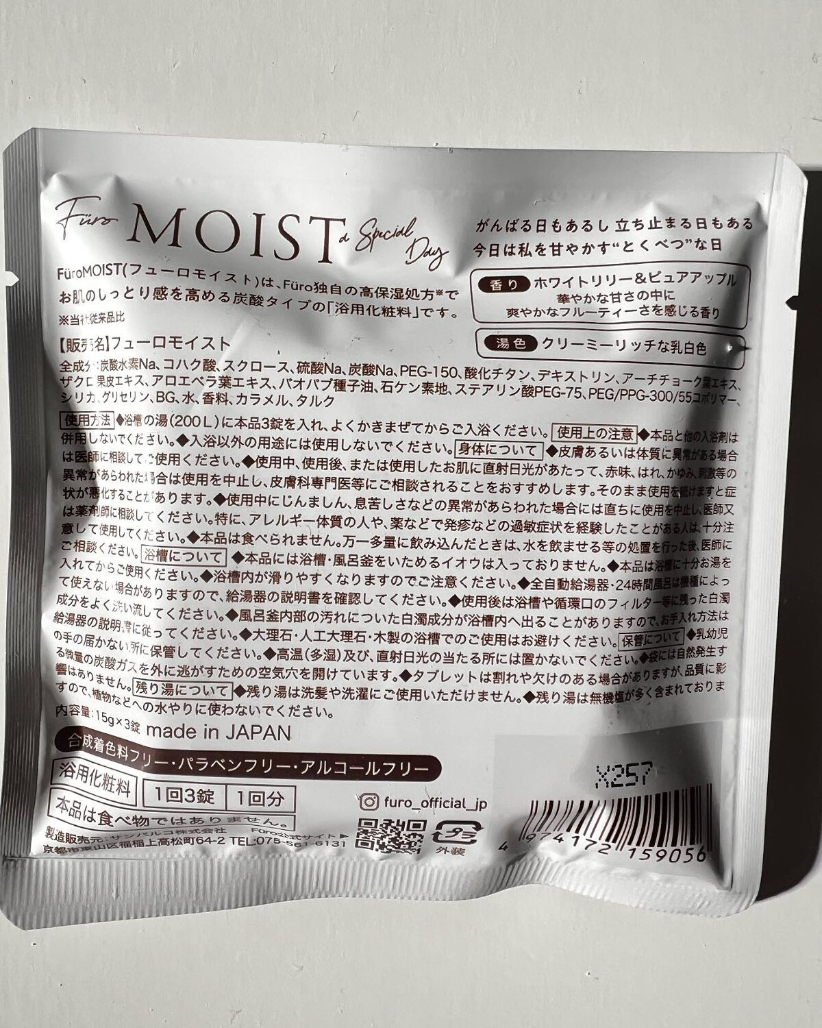 - Furo MOIST(フューロモイスト)は、Furo独自の高保湿処方※でお肌にしっとり感を与える炭酸タイプの「浴用化粧料」です。ブラウンシュガー、美容オイル、厳選エキスなど、保湿成分を贅沢に配合。合成着色料フリー、パラベンフリー、アルコールフリー処方で生後3か月以上の赤ちゃんとも一緒に使えます。クリーミーリッチな乳白色のとろみ湯ヴェールをまとって、気持ちもとろけるリッチなバスタイムを。※当社従来品比