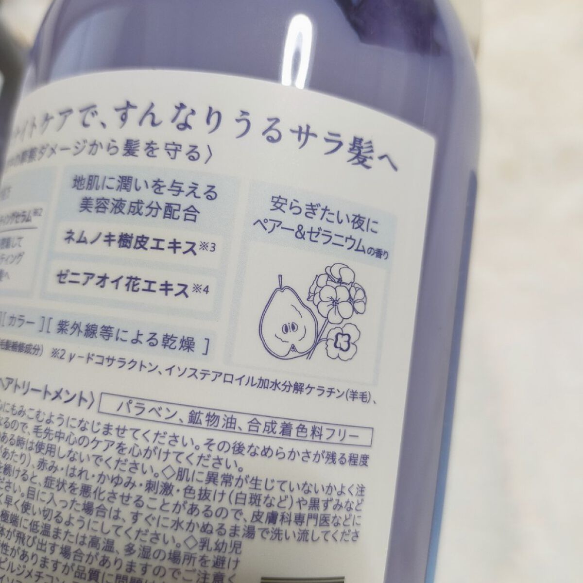 - ダメージリスクは日中だけでなく、夜にも。髪と地肌の濃密ナイトケアで、しっとりうるツヤ髪へ。 ナイトキャップ処方で睡眠中の摩擦・乾燥ダメージから髪を守り、地肌に潤いを与える美容液成分配合。 シャンプー:シリコン、パラベン、鉱物油、合成着色料フリー トリートメント:パラベン、鉱物油、合成着色料フリー ◎ネロリ&ピオニーの香り