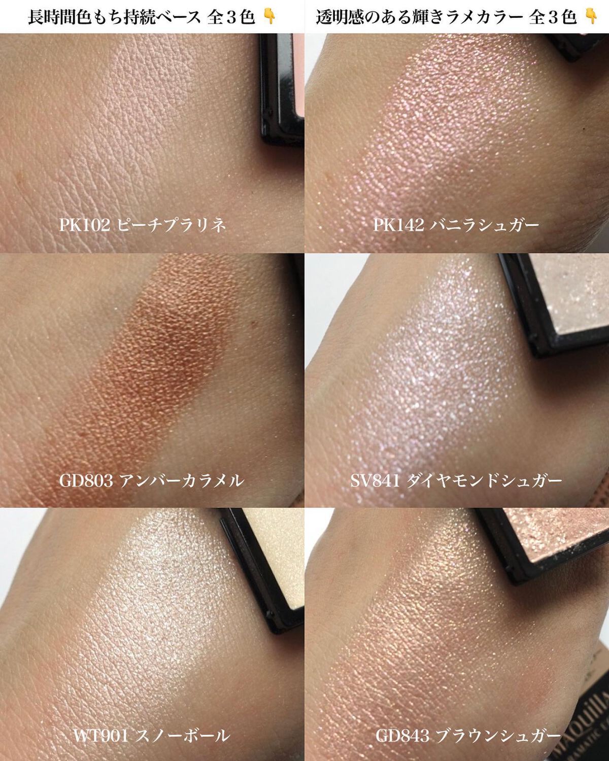 ひとつ990円(税込)というプチプラさもgood。 好きなカラー4つを組み合わせてオリジナルのパレットが作れるマキアージュのアイシャドウ。 全25色4タイプから、定番色の21色をスウォッチしてみました! PK102 ピーチプラリネは、ほんのりピンクでまぶたトーンUP。アイシャドウベースとして使うのがお気に入り!LUNASOLのアイシャドウベースが好きな方はこちらも好きだと思う♡うすく伸ばせばヨレないです! その他、私のお気に入りは ◽OR531 ショコラオランジュ ◽BE212 クリームミルクティ(パール) ◽BR313 マロンロシェ(パール) ◽RD518 ブリックショコラ(マット)かな。 全色を使って、メイク5パターンしていきたいと思います〜!