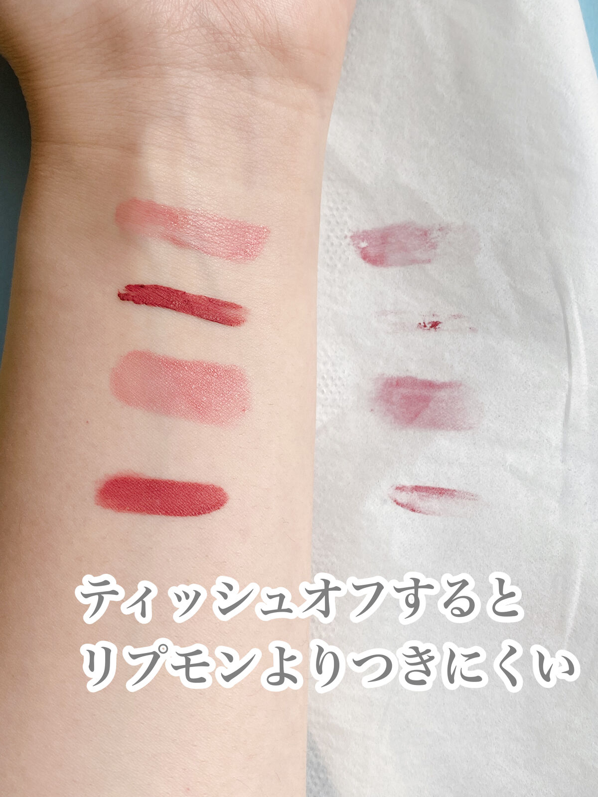 - つけたての色が長時間持続 ふんわりマット質感に変化 落ちにくい液状リップ ■高発色スフレ処方:唇から蒸発する水分を活用してしっとりジェル膜へ変化 液状リップの油分が揮発してふんわりマット質感に変化 ■リップモンスターの機能を踏襲 つけたそのままの色が長時間持続 マスクをしても色落ちしにくい 飲み物を飲んでもカップにつきにくい