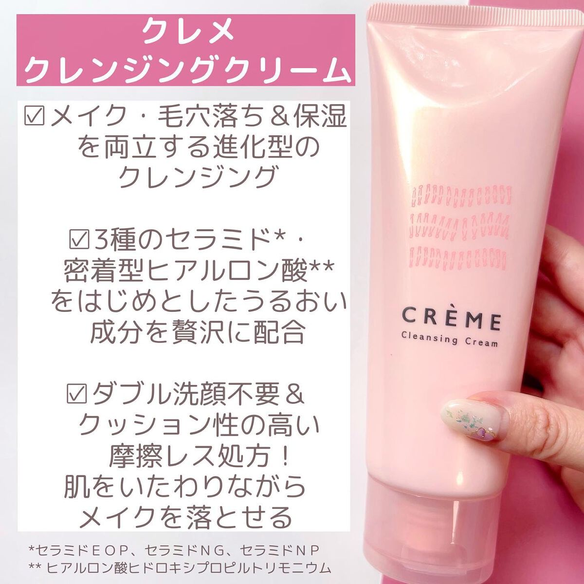 - ※2024年2月9日〜パッケージリニューアル。 「メイク・毛穴汚れ落ち」と「保湿」を両立したクレンジングクリーム。 お肌になじませるとオイル状に変化して、メイクや毛穴汚れと素早くなじんでしっかり落とします。 洗い流し後はベタつかず、つるんとうるおう肌に。 3種のセラミド*1・NMF成分*2・密着型ヒアルロン酸*3などのうるおい成分を配合。 ダブル洗顔不要&クッション性の高い摩擦レス処方で、クレンジング時のお肌の負担を軽減します。 *1 セラミドEOP、セラミドNG、セラミドNP *2 PCA-Na、リシンHCI、グリシン、アラニン、アスパラギン酸Na、アルギニン、イソロイシン、グルタミン酸、トレオニン、セリン、チロシン、パリン、ヒスチジンHCI、フェニルアラニン、プロリン、ロイシン *3 ヒアルロン酸ヒドロキシプロピルトリモニウム