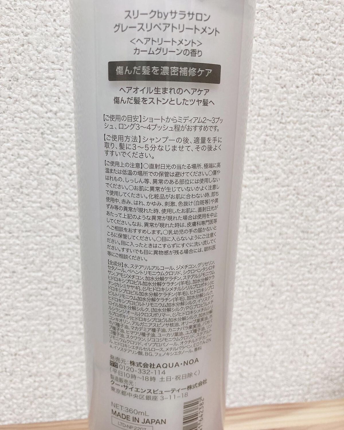 - <トリートメント 360ml> 水、ステアリルアルコール、ジメチコン、グリセリン、セタノール、ベヘントリモニウムクロリド,フェノキシエタノール、香料、イソプロパノール、オクチルドデカノール、ヒドロキシエチルセルロース、ジココジモニウムクロリド、メチルパラベン、EDTA-2Na、アモジメチコン、ステアルトリモニウムクロリド、アルガニアスピノサ核油、シクロペンタシロキサン、バオバブ種子油、ヒマワリ種子油、ユーカリ葉油、ユズ種子油、リンゴ種子油、加水分解ケラチン、イソステアリン酸、(加水分解シルク/PGプロピルメチルシランジオール)クロスポリマー、BG、スクワラン、(ジヒドロキシメチルシリルプロポキシ)ヒドロキシプロピル加水分解ケラチン(羊毛)、ヒドロキシプロピルトリモニウム加水分解ケラチン(羊毛)、(ジヒドロキシメチルシリルプロポキシ)ヒドロキシプロピル加水分解シルク、オリーブ果実油、ホホバ種子油、マカデミア種子油、ステアルジモニウムヒドロキシプロピル加水分解ケラチン(羊毛)、加水分解ケラチン(カシミヤヤギ)、加水分解シルク、ヒドロキシプロピルトリモニウム加水分解シルク、イソステアロイル加水分解シルク、加水分解コンキオリン、カニナバラ果実油 <シャンプー 360ml> 水、ラウロイルメチルアラニンNa、コカミドプロピルベタイン、コカミドDEA、ココイルグルタミン酸Na、ラウロイル加水分解シルクNa、ココイルメチルタウリンNa、コカミドMEA、ヒドロキシプロピルトリモニウム加水分解ケラチン(羊毛)、(ジヒドロキシメチルシリルプロポキシ)ヒドロキシプロピル加水分解ケラチン(羊毛)、ステアルジモニウムヒドロキシプロピル加水分解ケラチン(羊毛)、加水分解ケラチン(カシミヤヤギ)、加水分解ケラチン、加水分解シルク、(ジヒドロキシメチルシリルプロポキシ)ヒドロキシプロピル加水分解シルク、(加水分解シルク/PGプロピルメチルシランジオール)クロスポリマー、ヒドロキシプロピルトリモニウム加水分解シルク、イソステアロイル加水分解シルク、加水分解コンキオリン、オリーブ果実油、ホホバ種子油、マカデミア種子油、カニナバラ果実油、アルガニアスピノサ核油、バオバブ種子油、ヒマワリ種子油、ユーカリ葉油、ユズ種子油、リンゴ種子油、スクワラン、ココイル加水分解ダイズタンパクK、グリセリン、ジステアリン酸PEG-150、ポリクオタニウム-10、メチルパラベン、クエン酸、ポリクオタニウム-7、エチドロン酸、エチドロン酸4Na、イソステアリン酸、BG、ジラウロイルグルタミン酸リシンNa、ココイル加水分解コラーゲン、フェノキシエタノール、香料 <シャンプー詰替え 340ml> 水、ラウロイルメチルアラニンNa、コカミドプロピルベタイン、コカミドDEA、ココイルグルタミン酸Na、ラウロイル加水分解シルクNa、ココイルメチルタウリンNa、コカミドMEA、ヒドロキシプロピルトリモニウム加水分解ケラチン(羊毛)、(ジヒドロキシメチルシリルプロポキシ)ヒドロキシプロピル加水分解ケラチン(羊毛)、ステアルジモニウムヒドロキシプロピル加水分解ケラチン(羊毛)、加水分解ケラチン(カシミヤヤギ)、加水分解ケラチン、加水分解シルク、(ジヒドロキシメチルシリルプロポキシ)ヒドロキシプロピル加水分解シルク、(加水分解シルク/PGプロピルメチルシランジオール)クロスポリマー、ヒドロキシプロピルトリモニウム加水分解シルク、イソステアロイル加水分解シルク、加水分解コンキオリン、オリーブ果実油、ホホバ種子油、マカデミア種子油、カニナバラ果実油、アルガニアスピノサ核油、バオバブ種子油、ヒマワリ種子油、ユーカリ葉油、ユズ種子油、リンゴ種子油、スクワラン、ココイル加水分解ダイズタンパクK、グリセリン、ジステアリン酸PEG-150、ポリクオタニウム-10、メチルパラベン、クエン酸、ポリクオタニウム-7、エチドロン酸、エチドロン酸4Na、イソステアリン酸、BG、ジラウロイルグルタミン酸リシンNa、ココイル加水分解コラーゲン、フェノキシエタノール、香料 <トリートメント詰替え 340ml> 水、ステアリルアルコール、ジメチコン、グリセリン、セタノール、ベヘントリモニウムクロリド,フェノキシエタノール、香料、イソプロパノール、オクチルドデカノール、ヒドロキシエチルセルロース、ジココジモニウムクロリド、メチルパラベン、EDTA-2Na、アモジメチコン、ステアルトリモニウムクロリド、アルガニアスピノサ核油、シクロペンタシロキサン、バオバブ種子油、ヒマワリ種子油、ユーカリ葉油、ユズ種子油、リンゴ種子油、加水分解ケラチン、イソステアリン酸、(加水分解シルク/PGプロピルメチルシランジオール)クロスポリマー、BG、スクワラン、(ジヒドロキシメチルシリルプロポキシ)ヒドロキシプロピル加水分解ケラチン(羊毛)、ヒドロキシプロピルトリモニウム加水分解ケラチン(羊毛)、(ジヒドロキシメチルシリルプロポキシ)ヒドロキシプロピル加水分解シルク、オリーブ果実油、ホホバ種子油、マカデミア種子油