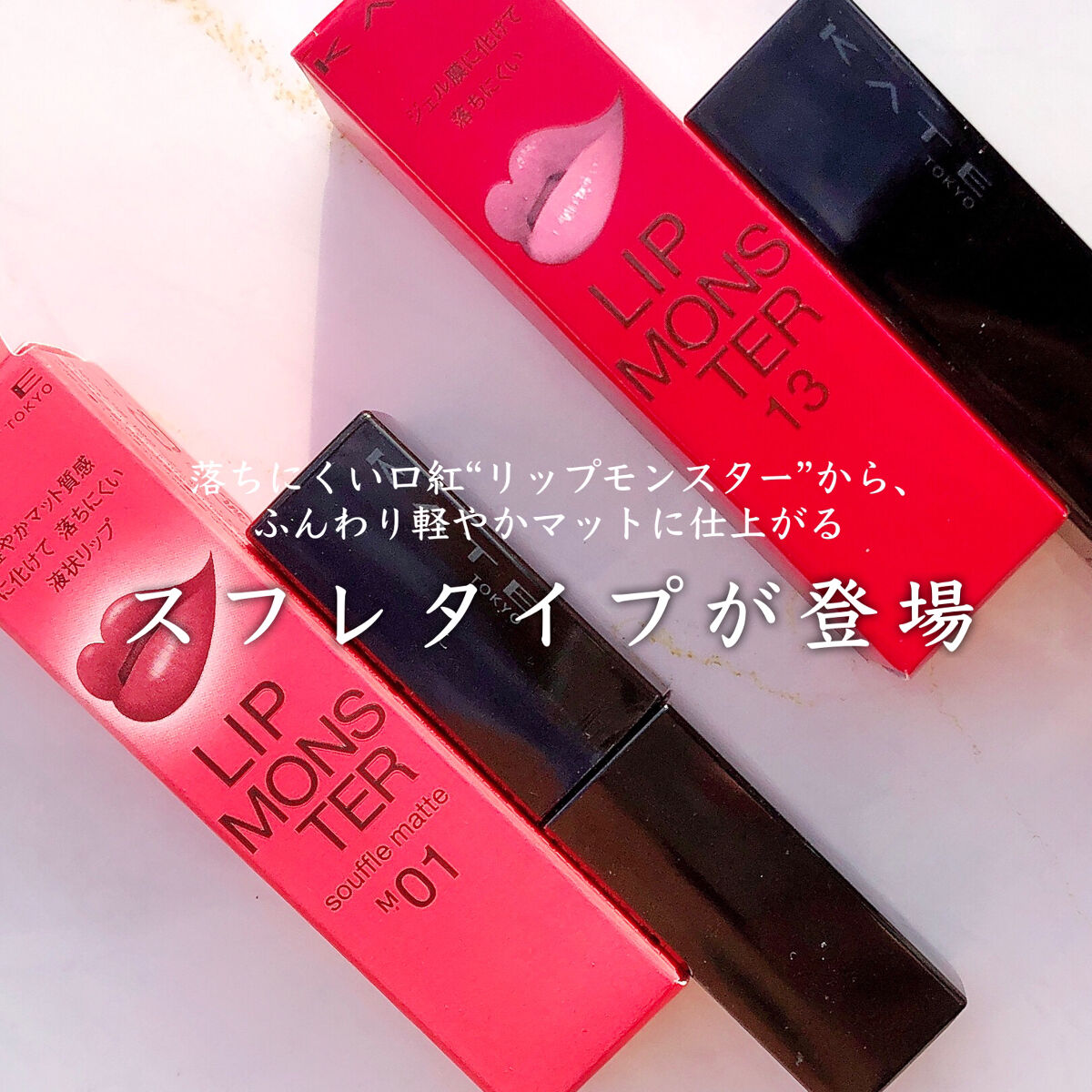 KATEリップモンスタースフレマットM01深紅の闇/M03祝いの紙吹雪/M05泥霧つけたての色がそのまま持続して、落ちにくい口紅リップモンスターから、長時間乾燥しにくいふんわり軽やかスフレマットタイプ登場!ふわふわのスフレマットでチップでさっ...