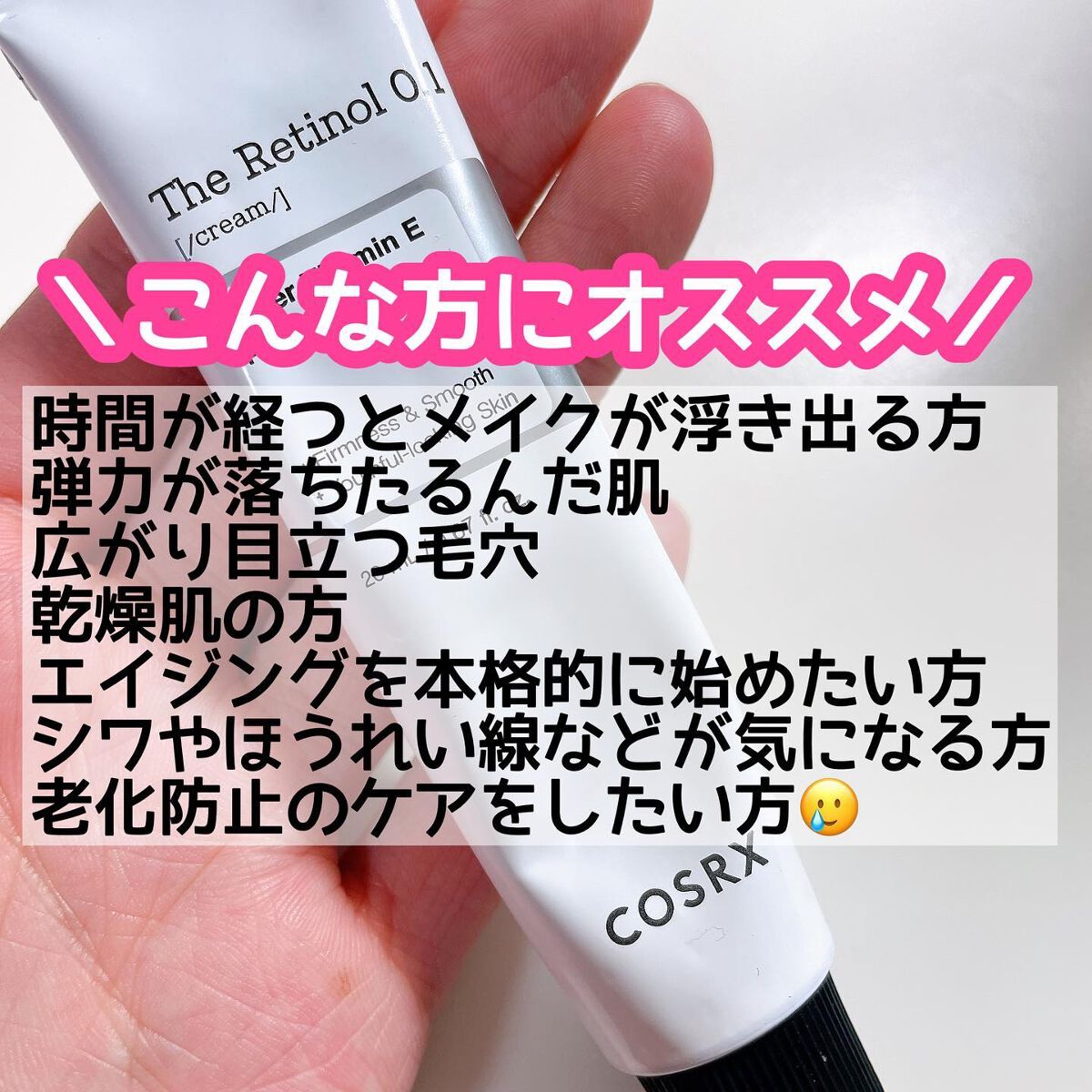 - #初心者向けのレチノール #初めてのレチノール ◎純粋レチノール0.1%安定化処方(保湿成分として) ◎お家で本格的な皮膚科学に基づいた保湿ケアが可能 ◎乾燥による毛穴目立ち/弾力/ハリにこだわりの保湿効果 ・「ノンコメドジェニックテスト(*1)」済み ・「敏感肌対象一次刺激テスト(*1)」済み ・「皮膚一次刺激テスト(*1)」済み 【こんな方におすすめ】 ・乾燥により目立った毛穴がお悩みの方 ・早めにエイジングケア(*2)を始めたい方 ・特に20代におすすめ ・時間が経つとメイクが浮き出る方 【注意事項】 ・アルミチューブの特性上初回オープン時に飛び出す可能性がございますのでご注意ください。 ・品質維持のため冷蔵保存おすすめ *1 )全ての方にコメド(ニキビのもと)や刺激が発生しないということではありません。 *2 )年齢を重ねた肌にうるおいを与えること