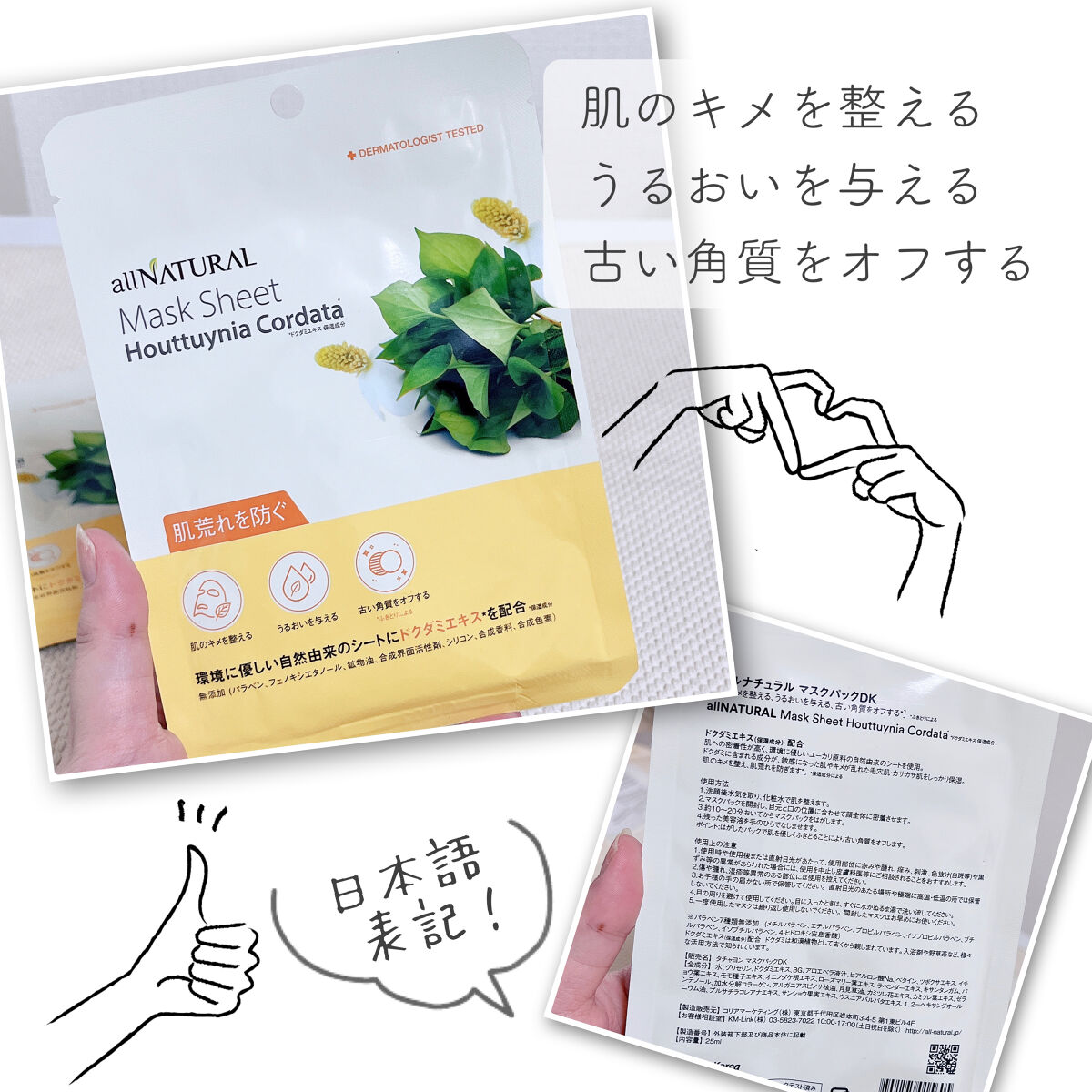 ドクダミエキス➡️肌荒れ防止・キメを整える 高分子ヒアルロン酸➡️保水力が高くバリア機能高める ノンコメドジェニックテスト 7つの有害化学物質 無添加 刺激テスト 完了 固めのシートで大きめサイズ 余っていた液の量はちょうどよく首まで保湿できる笑