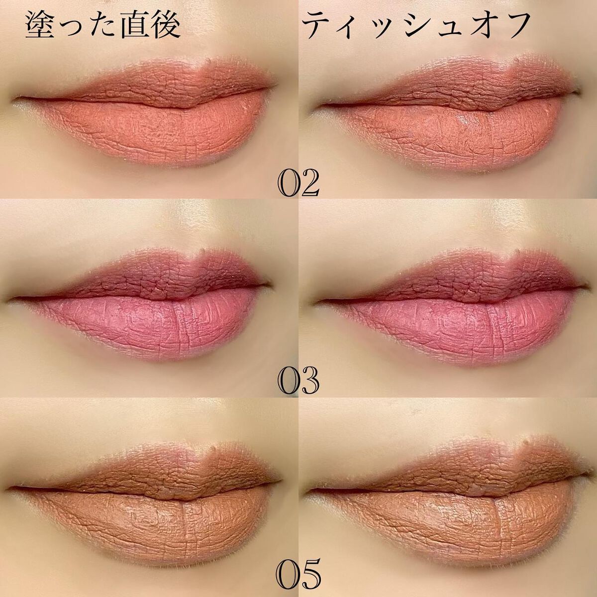 つけたての色がそのまま持続。落ちにくい口紅〝リップモンスター〟から、長時間乾燥しにくいふんわり軽やかスフレマットタイプ登場 ふわっとした塗り心地で発色良し🙆♀️ チップは固くて細かいところまで塗りやすい そんなにたっぷり液がベターっとつかないならぼかし塗りしやすい このスフレマットティッシュオフしてもほとんど色が落ちない! 1度のティッシュオフくらいではbefore、afterの違いがほぼなく写真じゃ分からないw