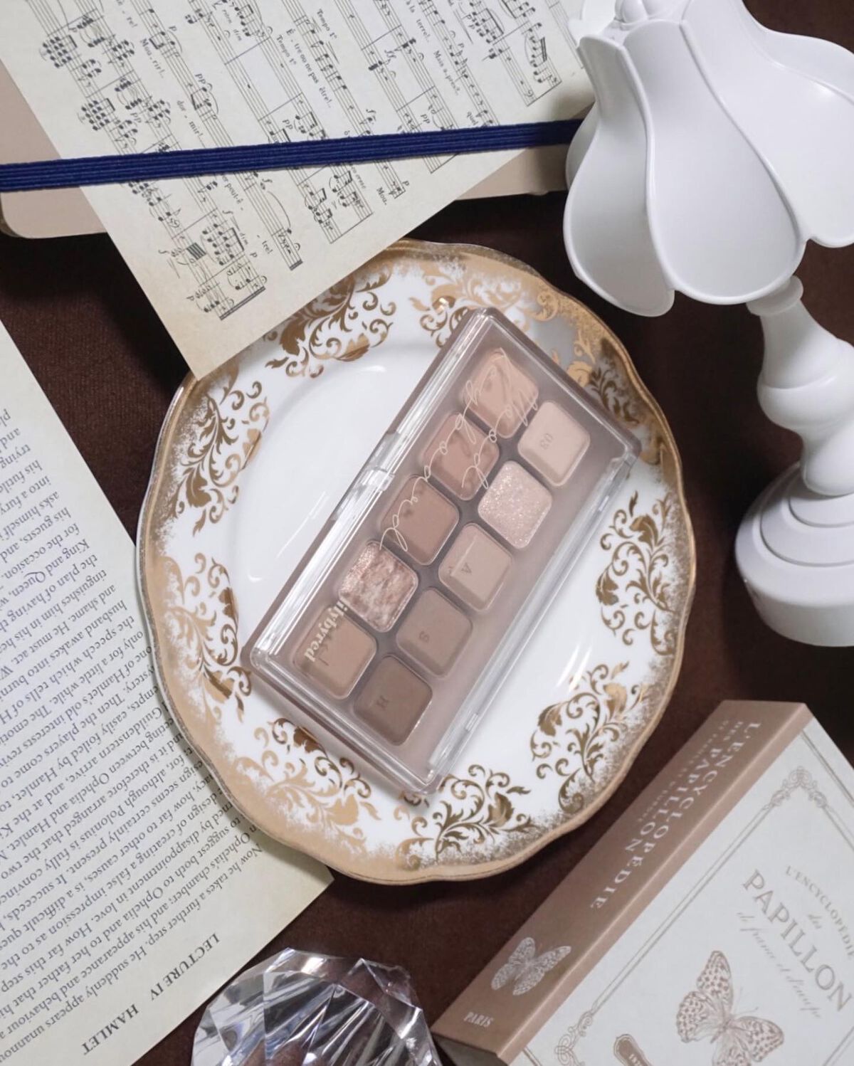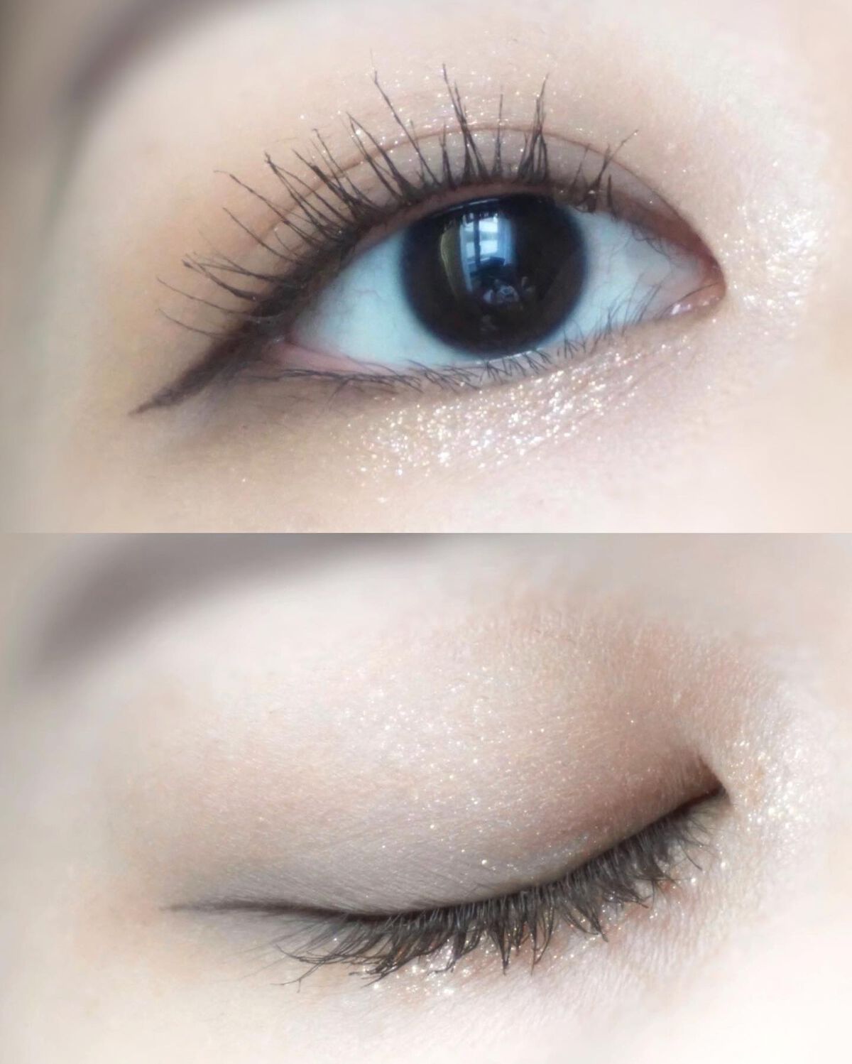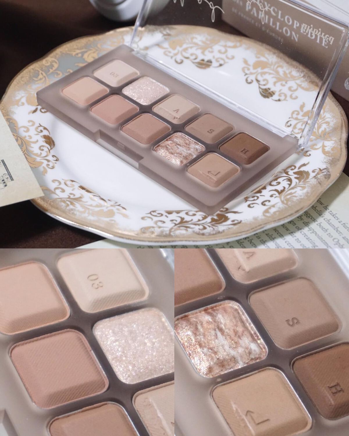 くすみグレー系のパレットが欲しく購入し、家に届いて開封した時意外とブラウン感が強くて失敗したかな?と思いましたが、瞼に塗るとくすみグレージュに発色。 左上のベースカラーはほとんど発色はないといってもいいくらい、他2つのマットカラーは発色がよく、ラメシャドウは割と煌めきが強い繊細ラメが使用されており、ギラッと輝く印象を受けました。 マットシャドウはrom&nd特有の比較的柔らかめでサラッとした質感、ラメシャドウは繊細ラメでサラッとしていて思ったよりラメ飛びはしない印象です。