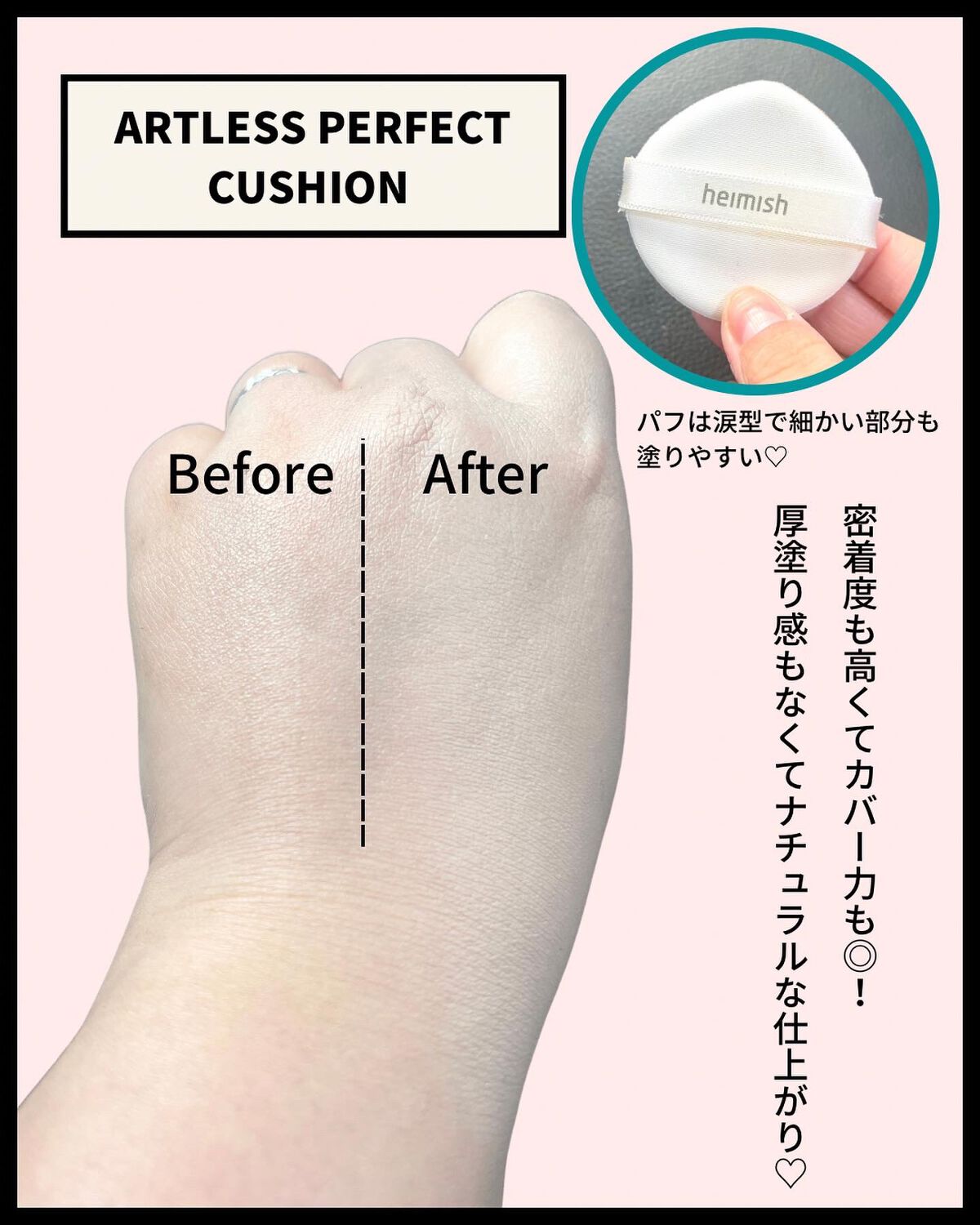 相変わらずの最大72時間のメイク持続力 そして、ツヤも24時間持続してくれる! 皮脂を吸収しやすいパウダー配合で 脂性肌さんでもツヤ肌になれちゃいます♡ 形は他のクッションと同じでたまご型 パフも少し薄めだけどクッション性があります。 そして、気になるマスクのつきづらさ! 家の中で怪しさ満点で6時間ほど マスクして過ごしたところ… 最近、使ったファンデの中で1番 ついてない!! ピンクと何が違うの?と… 見比べて見るとピンクの方がカバー力重視な 部分もあるのでピンク系で少し明るめな気が… でも、レッドが決してカバー力がないわけでは ないのでキレイに仕上がりますよ♡