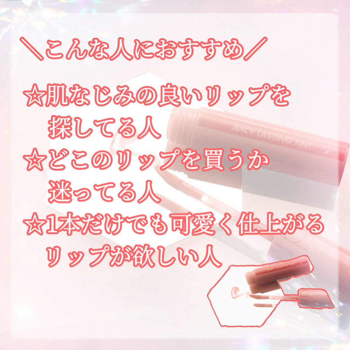 色やツヤ感はとっても可愛いくて 大好きです♡ ほんとに清楚系女子って感じです♬.*゚ 色味やちゅるんと感は とっても可愛いので 唇が荒れにくい方、 気になった方は是非見てみて下さい👀