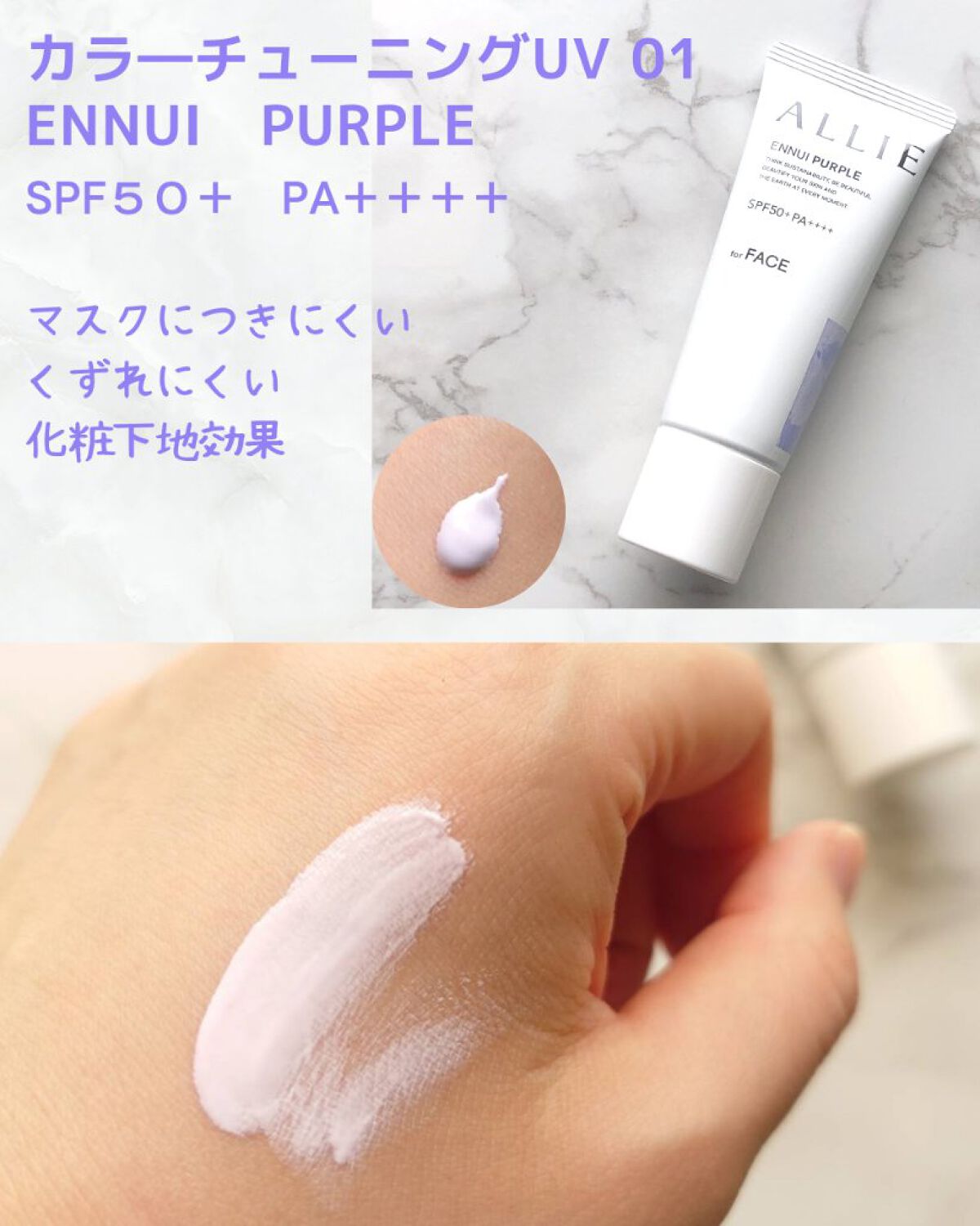 - 世界を想う 美しさつづく*1 日やけ止め おでかけも、マスクを外す機会も増える毎日に。 一部の国・地域・ビーチの規制に配慮した設計のビーチフレンドリー処方。 これ 1 本で、UV カット&顔色補整効果でクマ・くすみ・色ムラまでカバー! テカりにくく、くずれにくいノーファンデ UV*2 【ENNUI PURPLE】 くすみや毛穴をカバー 儚げな透明感のある顔印象続く 澄んだ気分を誘う 紫陽花しずく&セージの香り 【SUNNY APRICOT】 クマや毛穴をカバー いきいきとした血色感のある顔印象つづく 思わず出かけたくなる アプリコット&金木犀の香り 【SHERR BEIGE】 色ムラや毛穴をカバー 均一で抜け感のある顔印象つづく 自然で飾らない シトラスウッディ&パチュリの香り ●一部の国・地域・ビーチの規制に配慮した設計の「ビーチフレンドリー処方」 ●SPF50+・PA++++ ●汗・水 こすれに強く落ちにくい フリクションプルーフ・スーパーウォータープルーフ ●ベタつきにくい感触がつづく ●テカりにくくキレイな肌仕上がりがつづく ●環境に配慮した素材を使用したパッケージ採用 ●美容液成分(保湿)ヒアルロン酸Na配合 ●顔用 ●普段のメイククレンジングで落とせる ●マスク・タオル等につきにくい ●化粧下地効果 *1 スキンケア効果またはメイクアップ効果による肌仕上がりのこと *2 ファンデーション未使用時でも、自然なベースメイクが仕上がる日やけ止めのこと *3 チリ・ほこり・PM2.5・花粉等すべての微粒子汚れの付着を防ぐわけではありません 01:ENNUI PURPLE パープル 02:SUNNY APRICOT アプリコットピンク 03:SHEER BEIGE ミルキーベージュ