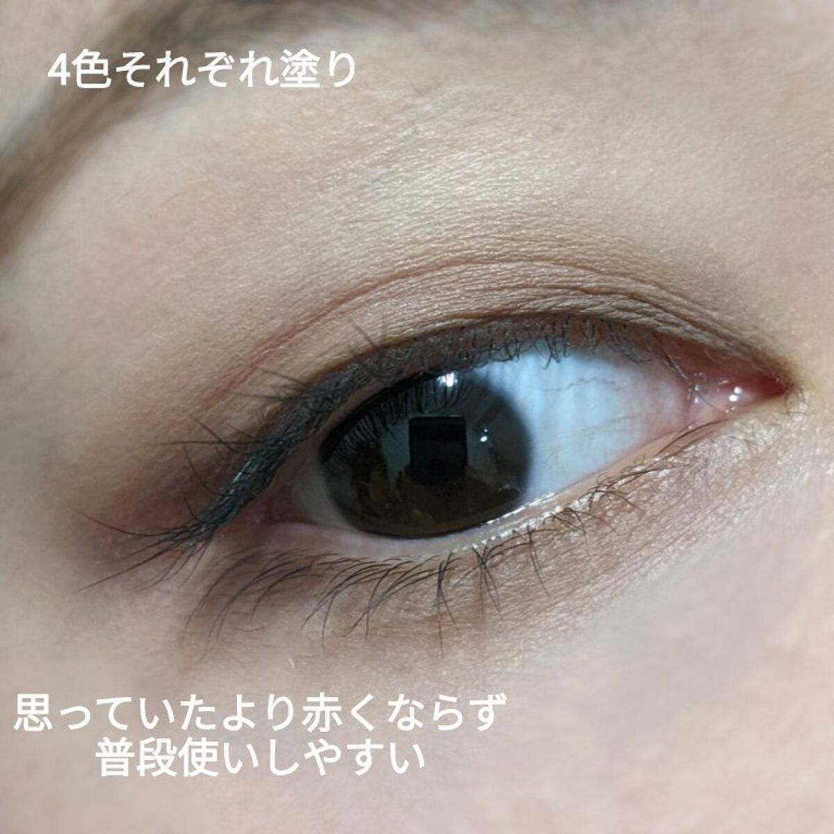 良かったところ・肌馴染みの良いカラーでナチュラルに目元を引き立ててくれる。・4色それぞれ違うニュアンスのツヤ感でその日の気分で印象が変えられる。 残念だった点(手持ちのアイベース無しの感想)・大粒パール?ラメが定着しにくい。乾燥肌だからか、頬に落ちたりしました。・二重幅に溜まりやすい。(アイベースありの感想)コフレドール のアイベース使用。・全体的にツヤ感が増して仕事用に使うと派手に見える。・アイベースとの相性が悪いとより二重幅に溜まるのが早い&汚い。
