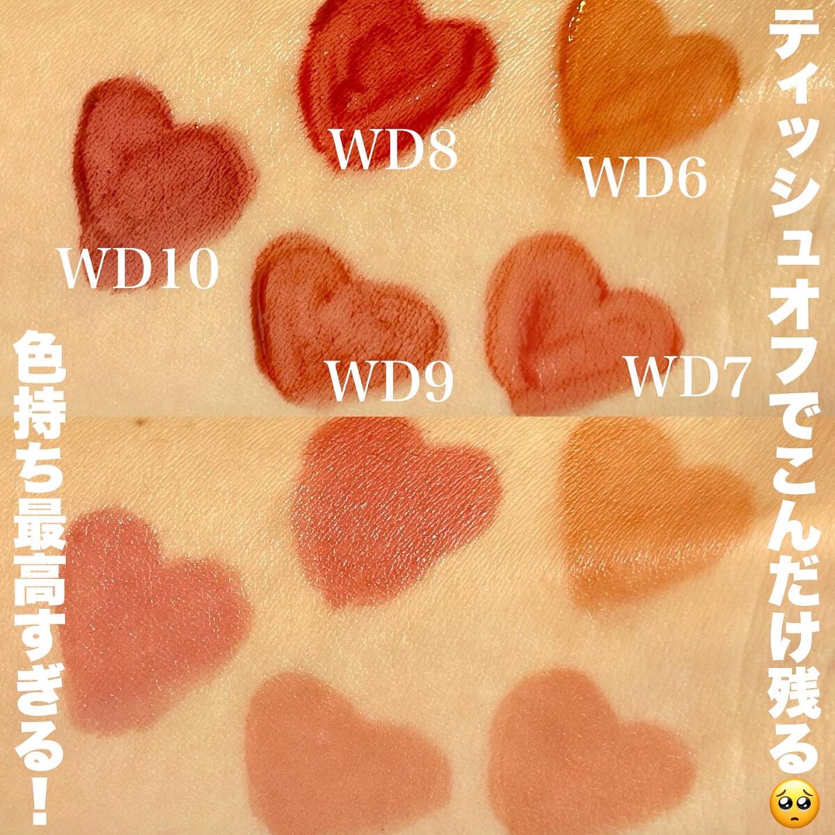 - <WD2 ビトゥン ローズ> 水、ジフェニルジメチコン、リンゴ酸ジイソステアリル、ビスジグリセリルポリアシルアジペート-2、水添ポリイソブテン、ジグリセリン、DPG、セチルPEG/PPG-10/1ジメチコン、イソステアリン酸ソルビタン、ポリソルベート60、ペンチレングリコール、オクチルドデカノール、セテアレス-20、(アクリル酸ヒドロキシエチル/アクリロイルジメチルタウリンNa)コポリマー、スクワラン、フェノキシエタノール、ポリグリセリン-3、ステビオシド、香料、エチルヘキシルグリセリン、グリセリン、シア脂、ツバキ種子油、トリ(カプリル酸/カプリン酸)グリセリル、アルガニアスピノサ核油、ホホバ種子油、アーモンド油、アンズ核油、月見草油、オリーブ果実油、テトラ(ジ-t-ブチルヒドロキシヒドロケイヒ酸)ペンタエリスリチル、カニナバラ果実エキス、マンゴー果実エキス、赤104(1)、赤227、黄5、青1 <WD3 ピンク ヘイズ> 水、ジフェニルジメチコン、リンゴ酸ジイソステアリル、ビスジグリセリルポリアシルアジペート-2、水添ポリイソブテン、ジグリセリン、DPG、セチルPEG/PPG-10/1ジメチコン、イソステアリン酸ソルビタン、ポリソルベート60、ペンチレングリコール、オクチルドデカノール、セテアレス-20、(アクリル酸ヒドロキシエチル/アクリロイルジメチルタウリンNa)コポリマー、スクワラン、フェノキシエタノール、ポリグリセリン-3、ステビオシド、香料、エチルヘキシルグリセリン、グリセリン、水酸化Al、ポリアクリル酸アンモニウム、BG、アルガニアスピノサ核油、シア脂、ツバキ種子油、トリ(カプリル酸/カプリン酸)グリセリル、アーモンド油、アンズ核油、ホホバ種子油、月見草油、オリーブ果実油、テトラ(ジ-t-ブチルヒドロキシヒドロケイヒ酸)ペンタエリスリチル、マンゴー果実エキス、カニナバラ果実エキス、酸化チタン、赤104(1)、赤227、黄5、青1 <WD4 オールウェイズ ヤング> 水、ジフェニルジメチコン、リンゴ酸ジイソステアリル、ビスジグリセリルポリアシルアジペート-2、水添ポリイソブテン、ジグリセリン、DPG、セチルPEG/PPG-10/1ジメチコン、イソステアリン酸ソルビタン、ポリソルベート60、ペンチレングリコール、オクチルドデカノール、セテアレス-20、(アクリル酸ヒドロキシエチル/アクリロイルジメチルタウリンNa)コポリマー、スクワラン、フェノキシエタノール、ポリグリセリン-3、ステビオシド、香料、エチルヘキシルグリセリン、グリセリン、シア脂、ツバキ種子油、トリ(カプリル酸/カプリン酸)グリセリル、アルガニアスピノサ核油、ホホバ種子油、アーモンド油、アンズ核油、月見草油、オリーブ果実油、テトラ(ジ-t-ブチルヒドロキシヒドロケイヒ酸)ペンタエリスリチル、カニナバラ果実エキス、マンゴー果実エキス、赤104(1)、赤227、黄5、青1 <WD6 クラッシュド パンプキン> 水、水添ポリイソブテン、リンゴ酸ジイソステアリル、ビスジグリセリルポリアシルアジペート-2、ジフェニルシロキシフェニルトリメチコン、ジフェニルジメチコン、ポリグリセリン-3、オクチルドデカノール、ポリソルベート60、セチルPEG/PPG-10/1ジメチコン、ラウリン酸ポリグリセリル-10、ペンチレングリコール、1,2-ヘキサンジオール、(アクリル酸ヒドロキシエチル/アクリロイルジメチルタウリンNa)コポリマー、PEG-60水添ヒマシ油、セテアリルアルコール、スクワラン、キシリトール、エチルヘキシルグリセリン、香料、ポリアクリル酸アンモニウム、イソステアリン酸ソルビタン、水酸化Al、フェノキシエタノール、BG、トコフェロール、酸化チタン、酸化鉄、赤227、黄4、黄5、青1 <WD8 ビンテージ カラント> 水、水添ポリイソブテン、リンゴ酸ジイソステアリル、ビスジグリセリルポリアシルアジペート-2、ジフェニルシロキシフェニルトリメチコン、ジフェニルジメチコン、オクチルドデカノール、ポリグリセリン-3、ポリソルベート60、セチルPEG/PPG-10/1ジメチコン、ラウリン酸ポリグリセリル-10、1,2-ヘキサンジオール、ペンチレングリコール、(アクリル酸ヒドロキシエチル/アクリロイルジメチルタウリンNa)コポリマー、PEG-60水添ヒマシ油、セテアリルアルコール、スクワラン、キシリトール、エチルヘキシルグリセリン、香料、イソステアリン酸ソルビタン、トコフェロール、赤104(1)、赤227、黄5、青1 <WD9 ミスター ストレンジャー> 水、水添ポリイソブテン、リンゴ酸ジイソステアリル、ビスジグリセリルポリアシルアジペート-2、ジフェニルシロキシフェニルトリメチコン、ジフェニルジメチコン、オクチルドデカノール、ポリグリセリン-3、ポリソルベート60、セチルPEG/PPG-10/1ジメチコン、ラウリン酸ポリグリセリル-10、1,2-ヘキサンジオール、ペンチレングリコール、(アクリル酸ヒドロキシエチル/アクリロイルジメチルタウリンNa)コポリマー、セテアリルアルコール、PEG-60水添ヒマシ油、スクワラン、キシリトール、エチルヘキシルグリセリン、香料、イソステアリン酸ソルビタン、水酸化Al、ポ