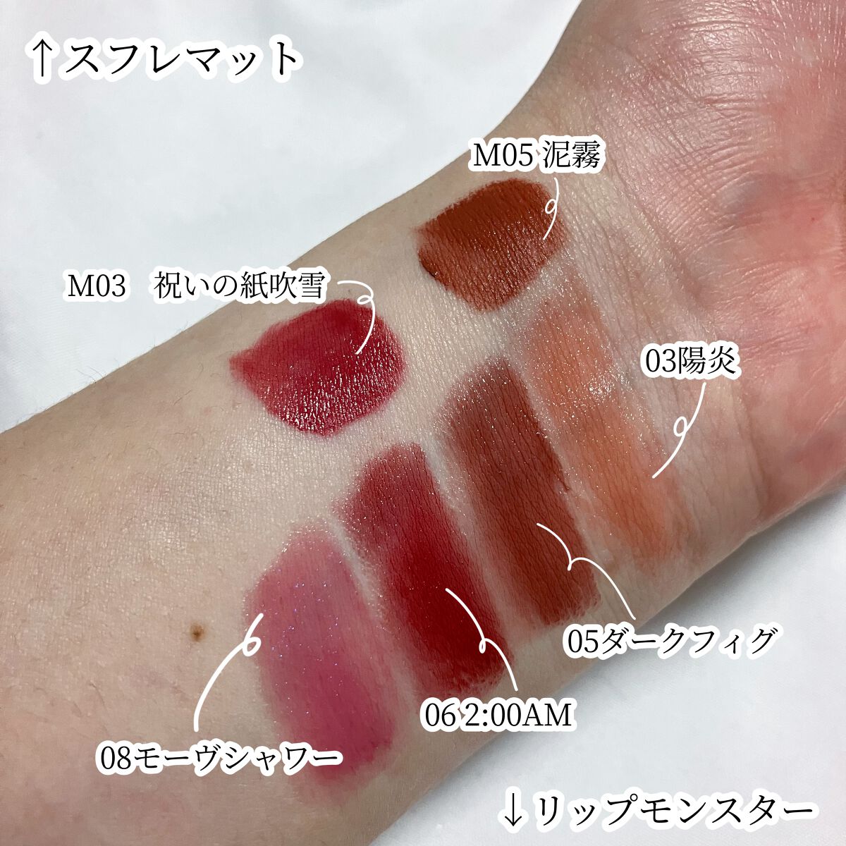 #提供❁.˚‧º‧‧º·˚.❁ リプモン スフレマット 4色スウォッチ❁.˚‧º‧‧º·˚.❁KATEリップモンスタースフレマットをお試し✧*˚₊‧ੈ✩おすすめポイントੈ✩‧₊˚*⋆つけたての色が長時間持続⋆ふんわりマット質感に変化する落...