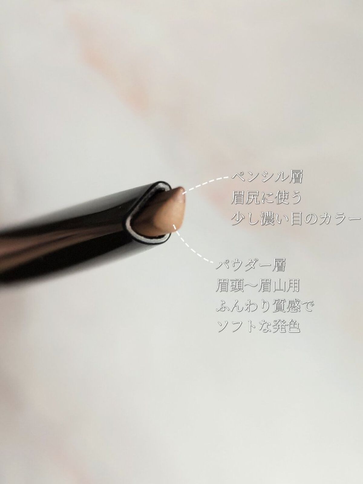 - 二層芯でふんわり眉頭もくっきり眉尻も簡単 ふんわりグラデーション眉が作れるブラシ付きアイブロウ ■ペンシル層(色の濃い方):角を使って眉尻をシャープに描ける、濃いカラー&なめらか質感 ■パウダー層(色の薄い方):眉全体をふんわり仕上げる、淡いカラー&パウダリー質感 ■全3色