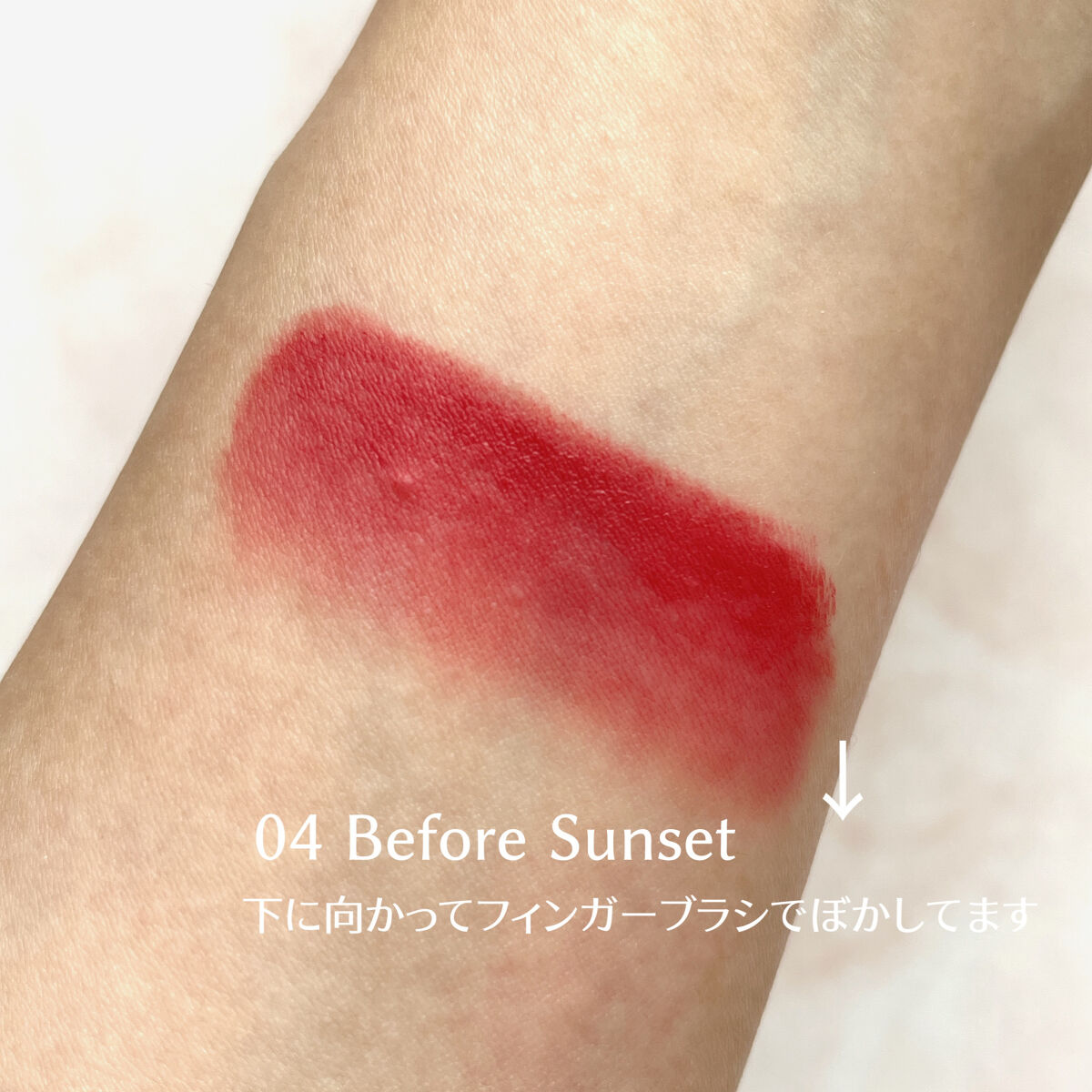 名前の通り、つけ心地がすごく軽い感じです。 落ちにくいけど乾燥はしました。 23 Ruddy Nude少し赤みのあるヌード唇にのせると腕のスウォッチよりも赤みが出ました。そこまで黄みが強くないのでブルベでも割と使いやすい気がします。 04 Before Sunsetピンクレッド少し青みよりな気がします。 20 Red Dive青みのあるレッドこれは舞台用に使いたいなと思って買いました。ブルベ冬さんに特におすすめな色だと思います。 ちなみにQoo10の公式ショップで購入したらおまけでフィンガーブラシをもらいました。指でぼかすみたいに使えるブラシでなかなか重宝しそうです。