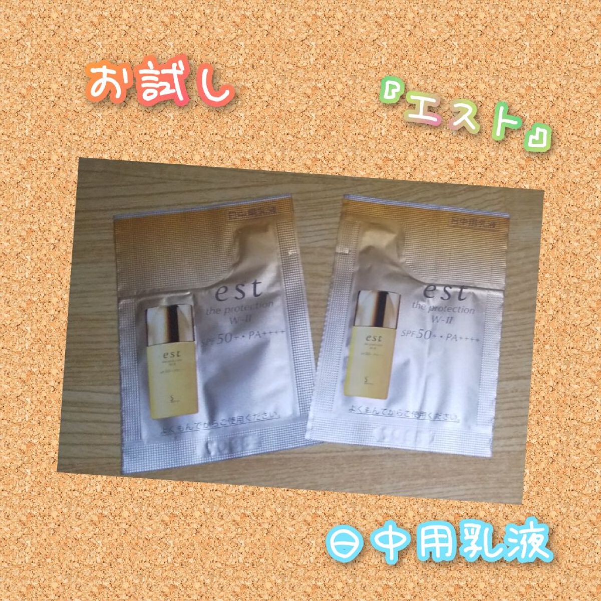花王estエストザプロテクションW‐IIしっとりタイプ(サンプルパウチ2つ使用)日中用乳液です匂いはデパコスぽい匂い個人的には嫌いじゃないほんのり日焼け止めぽい匂いもするトロッとしてて塗り広げやすい白い線になったりムラにならず良いマキアージュ...