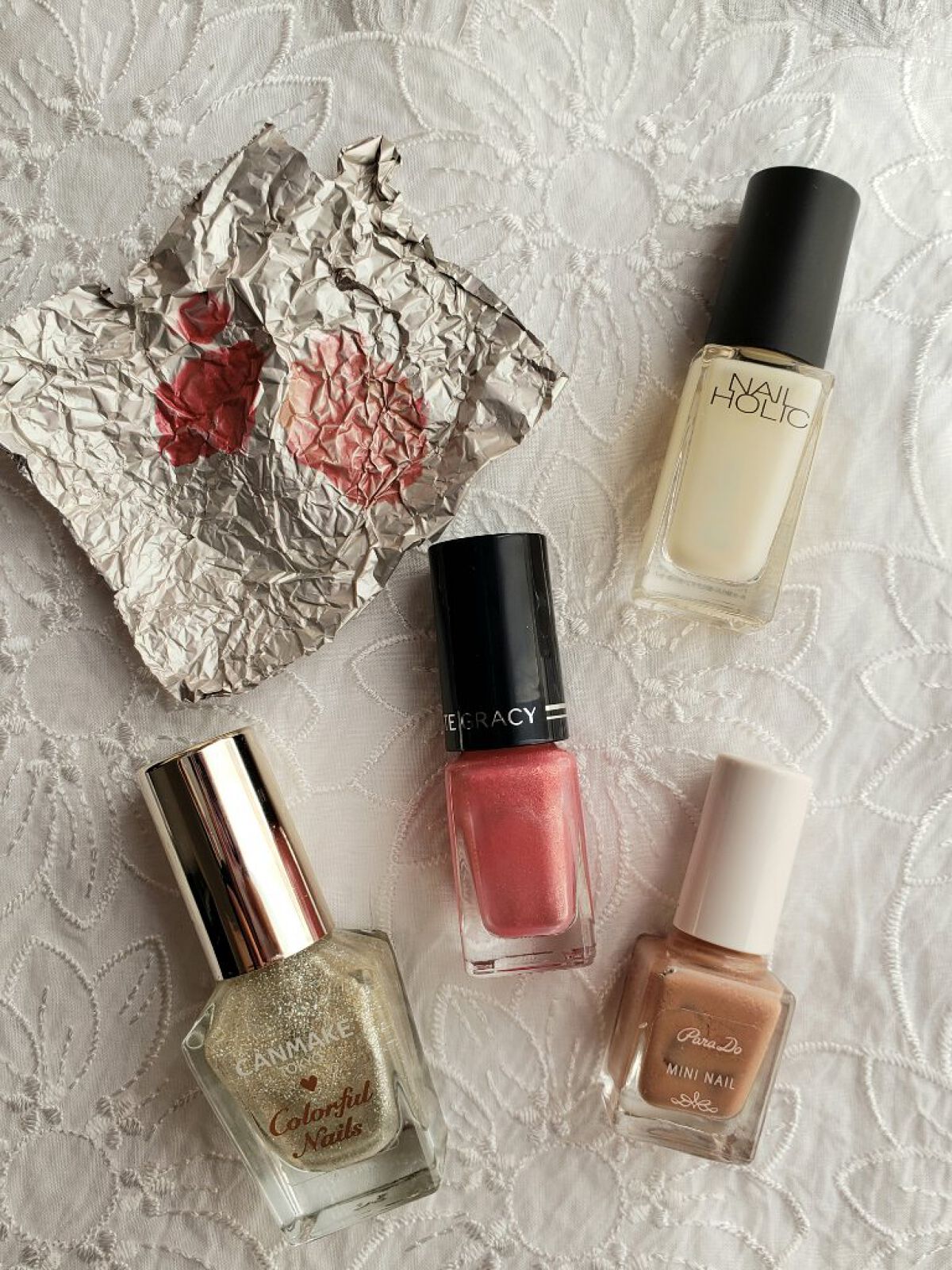 ポイントとしては、ガラスフレンチ部分は一息でやること…かな。 手順でいうと②~④だね。ベースにしたローズミルクティーが乾いたら、フレンチラインをひくところからメタルホロを貼り付けるところまでサッサッサッと💨 下準備として、メタルホロはちょうどいい大きさに切っておくと作業がスムーズ◎ それから、メタルホロを使うときは下にティッシュかキッチンペーパーを敷いておくと片付けもラク◎ 指一本ずつの作業だから、ネイルにかかる時間がかなり長くなるけど、やっぱりガラスフレンチは可愛い🖤