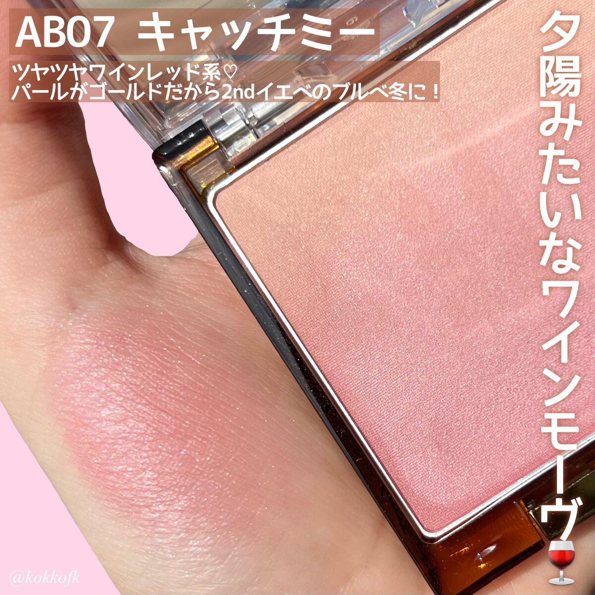 - <AB01-AB05共通> タルク、 ミリスチン酸亜鉛、 ジメチコン、 ジフェニルシロキシフェニルトリメチコン、 ワセリン、 セラミドNP、 スクワラン、 ホホバ種子油、 ブドウ種子油、 シリカ、 セスキイソステアリン酸ソルビタン、 トコフェロール、 水酸化Al、 フェノキシエタノール、 (+/-) グンジョウ、 マイカ、 黄4、 酸化チタン、 酸化鉄、 赤202、 赤226 <AB06-AB07> タルク、ミリスチン酸亜鉛、ジメチコン、ジフェニルシロキシフェニルトリメチコン、ワセリン、セラミドNP、スクワラン、ホホバ種子油、ブドウ種子油、シリカ、セスキイソステアリン酸ソルビタン、トコフェロール、水酸化Al、フェノキシエタノール、(+/-)グンジョウ、マイカ、酸化チタン、酸化鉄、赤226 <AB08-AB09> タルク、ミリスチン酸亜鉛、ジメチコン、ジフェニルシロキシフェニルトリメチコン、ワセリン、セラミドNP、スクワラン、ホホバ種子油、ブドウ種子油、シリカ、セスキイソステアリン酸ソルビタン、トコフェロール、水酸化Al、フェノキシエタノール、グンジョウ、マイカ、酸化チタン、酸化鉄、赤226、硫酸Ba