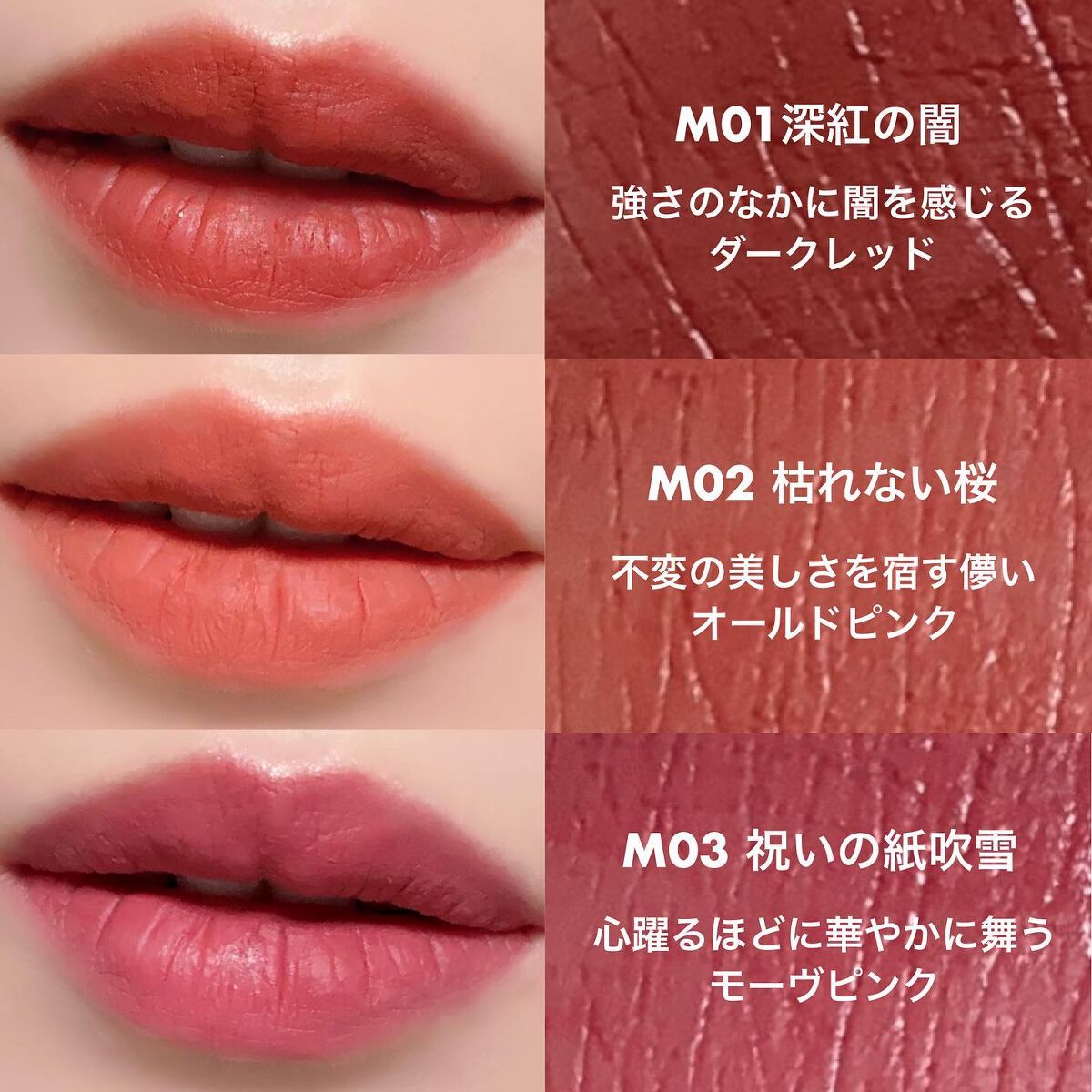 #提供❁.˚‧º‧‧º·˚.❁ リプモン スフレマット 4色スウォッチ❁.˚‧º‧‧º·˚.❁KATEリップモンスタースフレマットをお試し✧*˚₊‧ੈ✩おすすめポイントੈ✩‧₊˚*⋆つけたての色が長時間持続⋆ふんわりマット質感に変化する落...