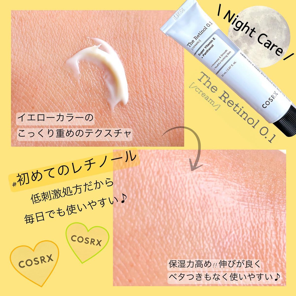 【COSRXTheRetinol0.1Cream】はじめてのレチノール!!初心者でもはじめやすいと聞いてはじめてみました。✔️レチノールって赤みや皮むけが出るって聞いて少し怖かったけど、このクリームはとってもマイルド!✔️パンテノールやビタミ...