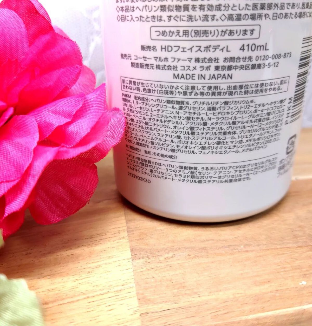 - <ボトルタイプ(220mL)> 有効成分 ヘパリン類似物質、グリチルリチン酸ジカリウム その他の成分 精製水、1,3-ブチレングリコール、濃グリセリン、流動パラフィン、トリ2-エチルヘキサン酸グリセリル、L-セリン、L-テアニン、N-アセチル-L-ヒドロキシプロリン、dl-α-トコフェロール、天然ビタミンE、2-エチルヘキサン酸セチル、N-ラウロイル-L-グルタミン酸ジ(コレステリル・ベヘニル・オクチルドデシル)、アクリル酸・メタクリル酸アルキル共重合体、イソステアリン酸、エデト酸二ナトリウム、オレイン酸フィトステリル、グリセリル-N-(2-メタクリロイルオキシエチル)カルバメート・メタクリル酸ステアリル共重合体、グリセリルグルコシド液、ジグリセリン、スクワラン、ステアリン酸、セトステアリルアルコール、トリエタノールアミン、フィトステロール、ベヘニルアルコール、ポリオキシエチレン硬化ヒマシ油、メチルポリシロキサン、モノイソステアリン酸ソルビタン、モノオレイン酸ポリオキシエチレンソルビタン(20E.O.)、ワセリン、親油型モノステアリン酸グリセリル、フェノキシエタノール、メチルパラベン <ポンプタイプ(410mL)> 有効成分 ヘパリン類似物質、グリチルリチン酸ジカリウム その他の成分 精製水、1,3-ブチレングリコール、濃グリセリン、流動パラフィン、トリ2-エチルヘキサン酸グリセリル、L-セリン、L-テアニン、N-アセチル-L-ヒドロキシプロリン、dl-α-トコフェロール、天然ビタミンE、2-エチルヘキサン酸セチル、N-ラウロイル-L-グルタミン酸ジ(コレステリル・ベヘニル・オクチルドデシル)、アクリル酸・メタクリル酸アルキル共重合体、イソステアリン酸、エデト酸二ナトリウム、オレイン酸フィトステリル、グリセリル-N-(2-メタクリロイルオキシエチル)カルバメート・メタクリル酸ステアリル共重合体、グリセリルグルコシド液、ジグリセリン、スクワラン、ステアリン酸、セトステアリルアルコール、トリエタノールアミン、フィトステロール、ベヘニルアルコール、ポリオキシエチレン硬化ヒマシ油、メチルポリシロキサン、モノイソステアリン酸ソルビタン、モノオレイン酸ポリオキシエチレンソルビタン(20E.O.)、ワセリン、親油型モノステアリン酸グリセリル、フェノキシエタノール、メチルパラベン <つめかえ用(370mL)> 有効成分 ヘパリン類似物質、グリチルリチン酸ジカリウム その他の成分 精製水、1,3-ブチレングリコール、濃グリセリン、流動パラフィン、トリ2-エチルヘキサン酸グリセリル、L-セリン、L-テアニン、N-アセチル-L-ヒドロキシプロリン、dl-α-トコフェロール、天然ビタミンE、2-エチルヘキサン酸セチル、N-ラウロイル-L-グルタミン酸ジ(コレステリル・ベヘニル・オクチルドデシル)、アクリル酸・メタクリル酸アルキル共重合体、イソステアリン酸、エデト酸二ナトリウム、オレイン酸フィトステリル、グリセリル-N-(2-メタクリロイルオキシエチル)カルバメート・メタクリル酸ステアリル共重合体、グリセリルグルコシド液、ジグリセリン、スクワラン、ステアリン酸、セトステアリルアルコール、トリエタノールアミン、フィトステロール、ベヘニルアルコール、ポリオキシエチレン硬化ヒマシ油、メチルポリシロキサン、モノイソステアリン酸ソルビタン、モノオレイン酸ポリオキシエチレンソルビタン(20E.O.)、ワセリン、親油型モノステアリン酸グリセリル、フェノキシエタノール、メチルパラベン