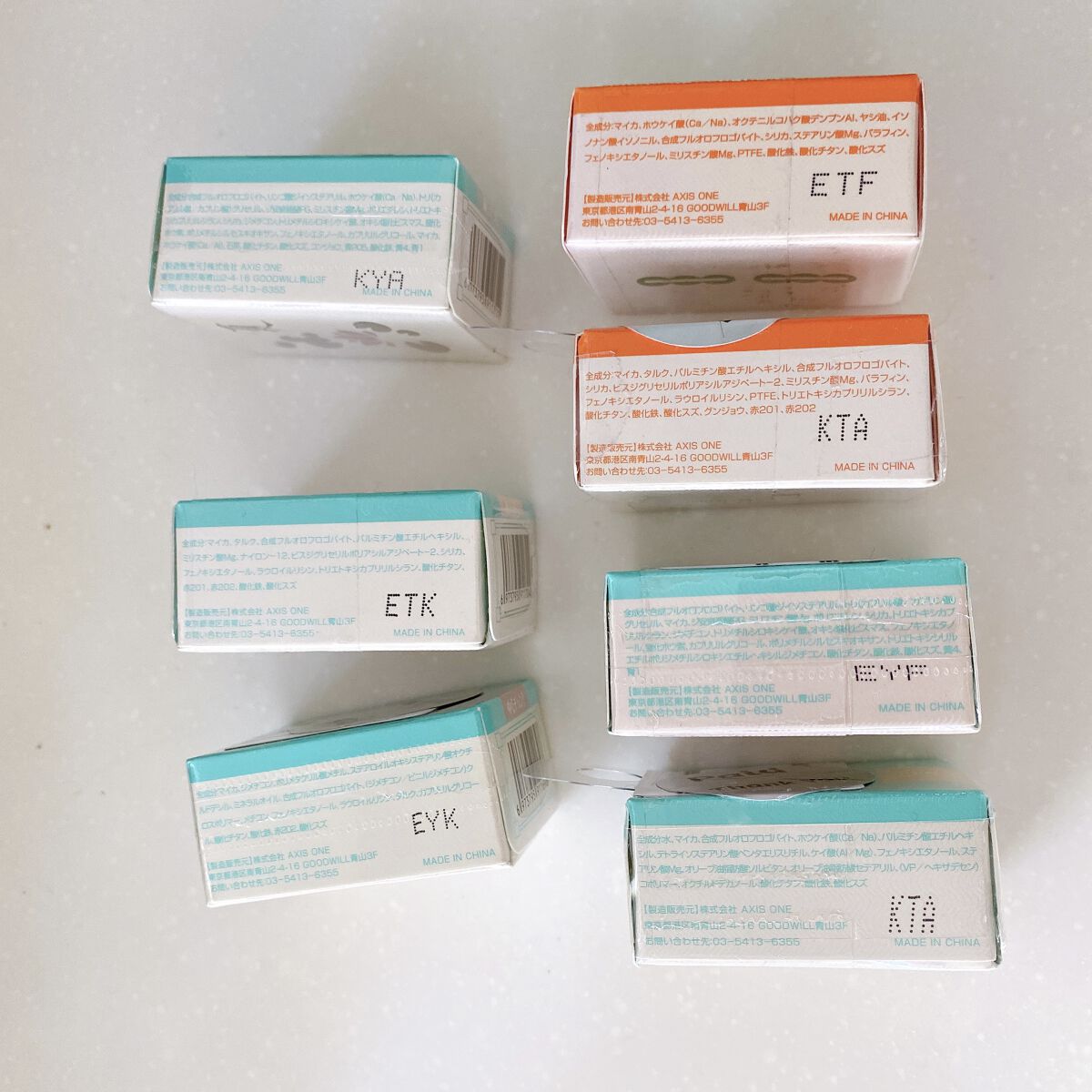 - 東【トン】マルーン:合成フルオロフロゴパイト、リンゴ酸ジイソステアリル、トリ(カプリル酸/カプリン酸)グリセリル、ジ安息香酸PG、ミリスチン酸Mg、ポリエチレン、シリカ、ジメチコン、トリメチルシロキシケイ酸、マイカ、トリエトキシカプリリルシラン、オキシ塩化ビスマス、窒化ホウ素、フェノキシエタノール、カプリリルグリコール、トリエトキシシリルエチルポリジメチルシロキシエチルヘキシルジメチコン、酸化鉄、酸化チタン、赤218、酸化スズ 南【ナン】アイリスパール:合成フルオロフロゴパイト、ジメチコン、イソノナン酸イソノニル、マイカ、ホウケイ酸(Ca/Al)、ジメチコンクロスポリマー、オキシ塩化ビスマス、シリカ、糖脂質、フェノキシエタノール、ミリスチン酸Mg、酸化チタン、コチニール、酸化スズ 西【シャー】ビリヤードグリーン:リンゴ酸ジイソステアリル、合成フルオロフロゴパイト、トリ(カプリル酸/カプリン酸)グリセリル、ジ安息香酸PG、ミリスチン酸Mg、シリカ、ホウケイ酸(Ca/Al)、ポリエチレン、トリエトキシカプリリルシラン、ホウケイ酸(Ca/Na)、ジメチコン、トリメチルシロキシケイ酸、オキシ塩化ビスマス、窒化ホウ素、フェノキシエタノール、ポリメチルシルセスキオキサン、カプリリルグリコール、マイカ、石英、酸化鉄、酸化チタン、酸化スズ、黄4、カルミン、コンジョウ、青1 北【ペイ】テラコッタ:マイカ、タルク、シリカ、ステアリン酸亜鉛、ミリスチン酸Mg、パルミチン酸エチルヘキシル、ステアロイルオキシステアリン酸オクチルドデシル、トリ(カプリル酸/カプリン酸)グリセリル、合成フルオロフロゴパイト、フェノキシエタノール、カプリリルグリコール、酸化鉄、酸化チタン、赤202、黄5 白【ハク】スノーホワイト:アルミナ、合成フルオロフロゴパイト、リンゴ酸ジイソステアリル、トリ(カプリル酸/カプリン酸)グリセリル、ジ安息香酸PG、ミリスチン酸Mg、ポリエチレン、トリエトキシカプリリルシラン、オキシ塩化ビスマス、シリカ、ジメチコン、トリメチルシロキシケイ酸、窒化ホウ素、ポリメチルシルセスキオキサン、フェノキシエタノール、ホウケイ酸(Ca/Al)、カプリリルグリコール、酸化チタン、酸化スズ、青1 發【ハツ】イエローブロンド:マイカ、ジメチコン、ホウケイ酸(Ca/Na)、イソノナン酸イソノニル、ジメチコンクロスポリマー、オキシ塩化ビスマス、シリカ、糖脂質、フェノキシエタノール、ミリスチン酸Mg、酸化チタン、酸化鉄、酸化スズ 中【チュン】オールドローズ:マイカ、ジメチコン、ポリメタクリル酸メチル、ステアロイルオキシステアリン酸オクチルドデシル、ミネラルオイル、合成フルオロフロゴパイト、(ジメチコン/ビニルジメチコン)クロスポリマー、メチコン、フェノキシエタノール、ラウロイルリシン、タルク、カプリリルグリコール、酸化チタン、酸化鉄、赤202、酸化スズ 春【ハル】チェリーブロッサム:マイカ、タルク、合成フルオロフロゴパイト、パルミチン酸エチルヘキシル、ミリスチン酸Mg、ナイロン-12、ビスジグリセリルポリアシルアジペート-2、シリカ、フェノキシエタノール、ラウロイルリシン、トリエトキシカプリリルシラン、酸化チタン、赤201、赤202、酸化鉄、酸化スズ 夏【ナツ】ペルーアクア:合成フルオロフロゴパイト、リンゴ酸ジイソステアリル、ホウケイ酸(Ca/Na)、トリ(カプリル酸/カプリン酸)グリセリル、ジ安息香酸PG、ミリスチン酸Mg、ポリエチレン、トリエトキシカプリリルシラン、シリカ、ジメチコン、トリメチルシロキシケイ酸、オキシ塩化ビスマス、窒化ホウ素、ポリメチルシルセスキオキサン、フェノキシエタノール、カプリリルグリコール、マイカ、ホウケイ酸(Ca/Al)、石英、酸化チタン、酸化スズ、コンジョウ、青205、酸化鉄、黄4、青1 秋【アキ】バーントシェンナ:タルク、マイカ、シリカ、ポリメチルシルセスキオキサン、ステアリン酸Mg、イソノナン酸イソノニル、(HDI/トリメチロールヘキシルラクトン)クロスポリマー、ポリヒドロキシステアリン酸エチルヘキシル、トリエトキシカプリリルシラン、パルミチン酸エチルヘキシル、ミリスチン酸Mg、フェノキシエタノール、リンゴ酸ジイソステアリル、酸化鉄 冬【フユ】メタリリックスノー:マイカ、タルク、シリカ、ステアリン酸Mg、ホウケイ酸(Ca/Na)、オキシ塩化ビスマス、ジメチコン、イソノナン酸イソノニル、PTFE、パラフィン、ジメチコンクロスポリマー、ミリスチン酸Mg、フェノキシエタノール、トリエトキシカプリリルシラン、糖脂質、酸化チタン、酸化スズ 菊【キク】キクパール:水、マイカ、合成フルオロフロゴパイト、ホウケイ酸(Ca/Na)、パルミチン酸エチルヘキシル、テトライソステアリン酸ペンタエリスリチル、ケイ酸(Al/Mg)、フェノキシエタノール、ステアリン酸Mg、オリーブ油脂肪酸ソルビタン、オリーブ油脂肪酸セテアリル、(VP/ヘキサデセン)コポリマー、オクチルドデカノール、酸化チタン、酸化鉄、酸化