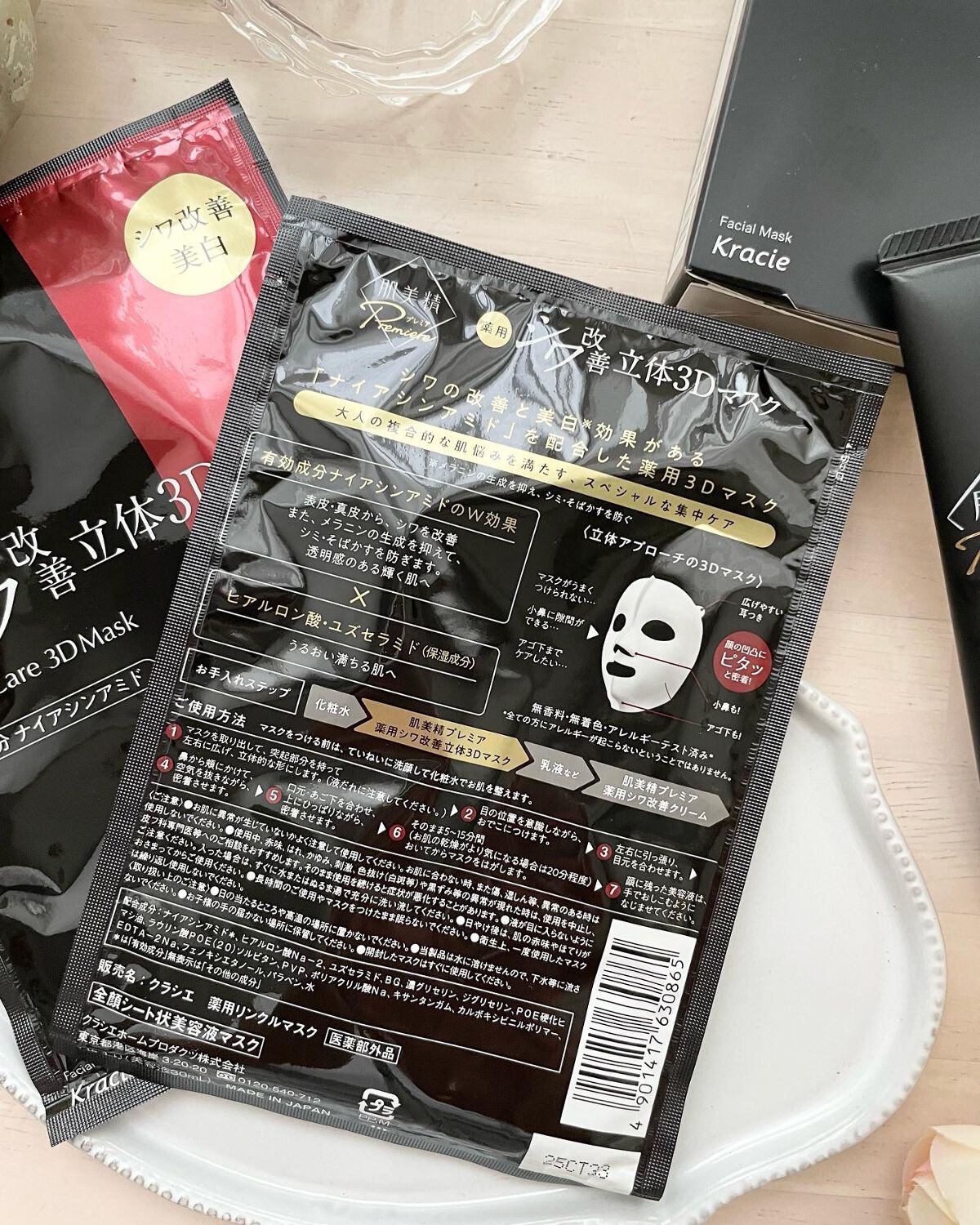 シワ改善有効成分「ナイアシンアミド」配合。肌の表面(表皮)と内部(真皮層)へのダブルのアプローチでシワを改善。美白効果*1も期待できます。 医薬部外品でこんなに成分が豊富なのに価格が2,000円前後なのがすごい!!!シワ改善系のクリームは高価なものが多くてなかなか手が出せないけれど、肌美精はすぐに使い始めたい!と思えるクリーム◎ 3D形状シートマスクがすごーく使いやすい!!キワまで攻めたい目もと、口もと、眉間などシワの気になるあらゆる部分に密着できるのが嬉しい◎