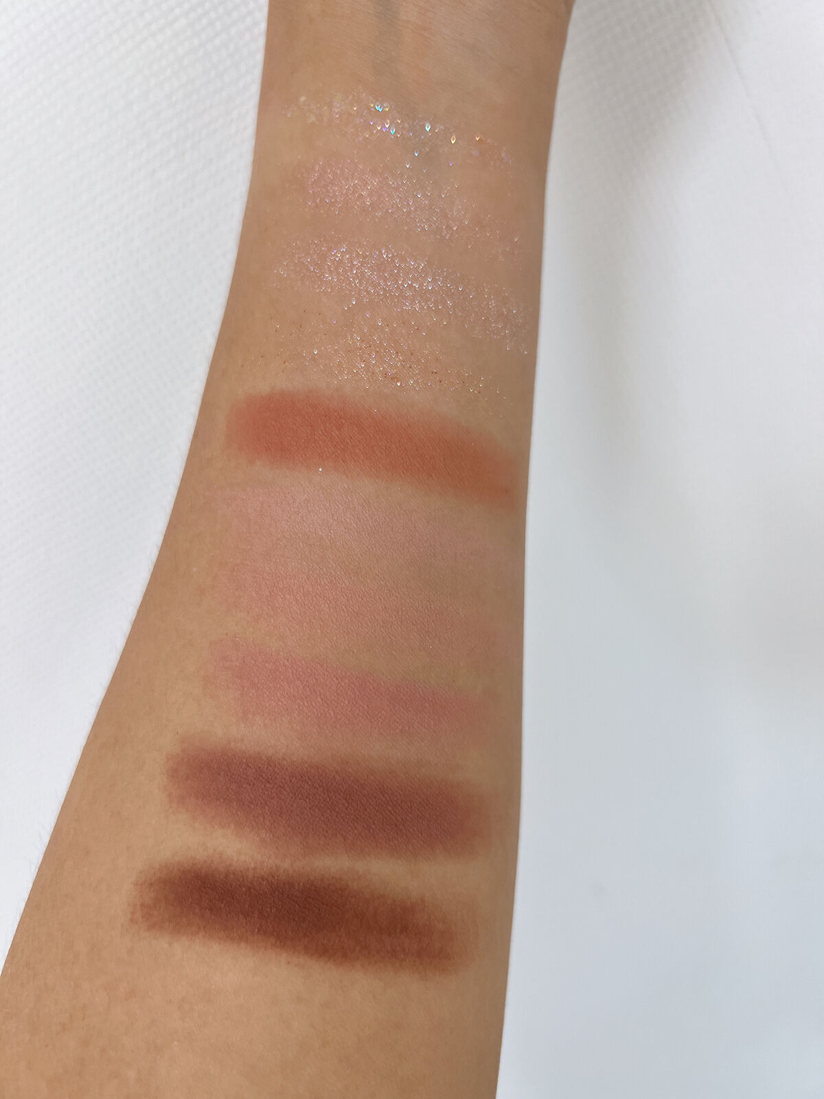 マットだけどどこかツヤ感もあるような柔らかい粉質……なのに粉飛びも少なめなので 瞼に乗せやすい🥰 5番のラメ感は控えめ。 シャンパンカラーに多色ラメがチラッ|˙꒳˙)✨ 実はこの番号通りにカラーを使うとプロ並みのメイクが完成するらしいです……‼️ ケースも薄くてコンパクトなのにベースカラー、ラメ、締め色、チークまで付いてるので 持ち運びやいつか行けるようになるであろう旅行などにも良さそうです❣️