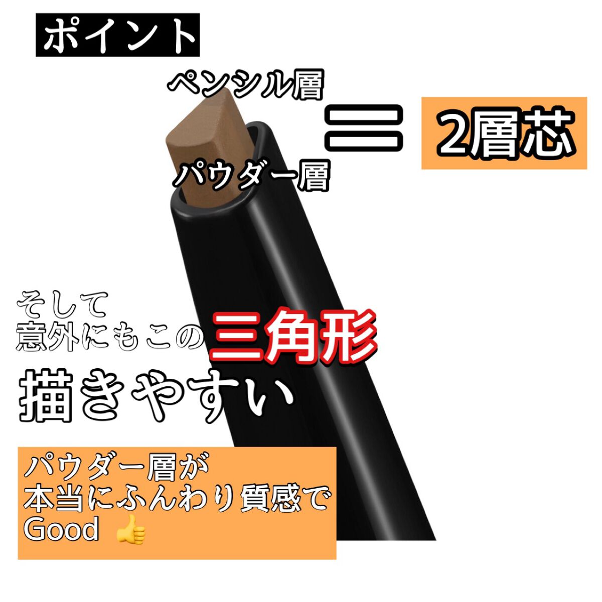 - 二層芯でふんわり眉頭もくっきり眉尻も簡単 ふんわりグラデーション眉が作れるブラシ付きアイブロウ ■ペンシル層(色の濃い方):角を使って眉尻をシャープに描ける、濃いカラー&なめらか質感 ■パウダー層(色の薄い方):眉全体をふんわり仕上げる、淡いカラー&パウダリー質感 ■全3色