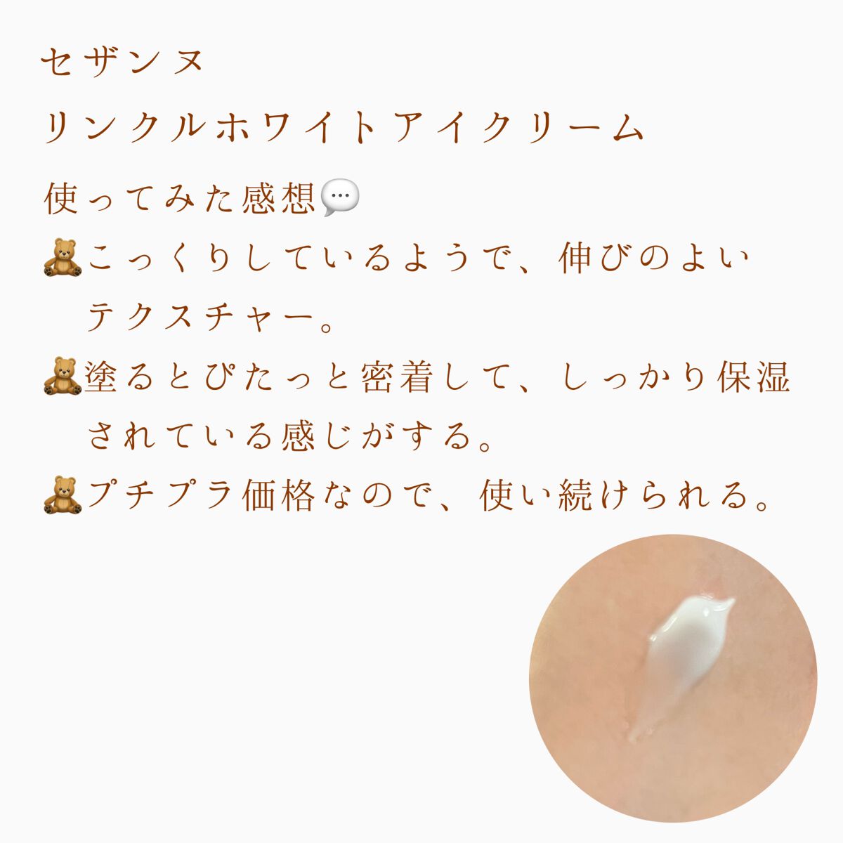 CEZANNEリンクルホワイトアイクリーム¥990CEZANNEのアイクリームが気になってて購入しました!クリームがこっくりとしていてベタつくことがなく塗り心地がすごく良かった!保湿力も申し分ないこれは絶対にリピする🧏🏻♀️🩵#アイクリーム...