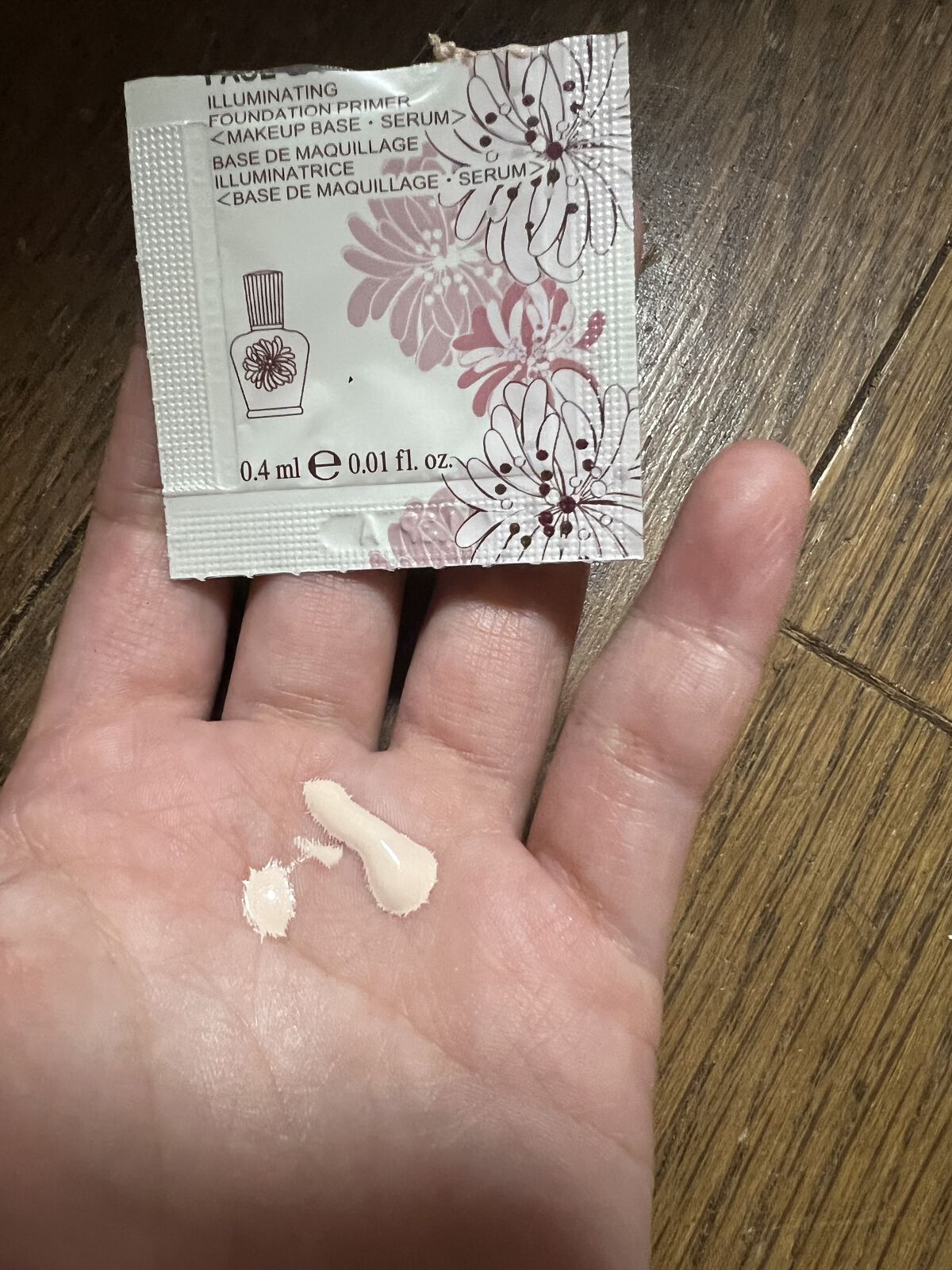 華やかな良い香り。肌に出した時は普通の下地の色なのに伸ばしていくとパール感のあるツヤツヤ肌に。 トーンアップもしてくれて肌を綺麗に魅せてくれるそれだけじゃなくしっとり感もあり。 冬場は乾燥で化粧が崩れやすいのでとってもありがたいプライマー。