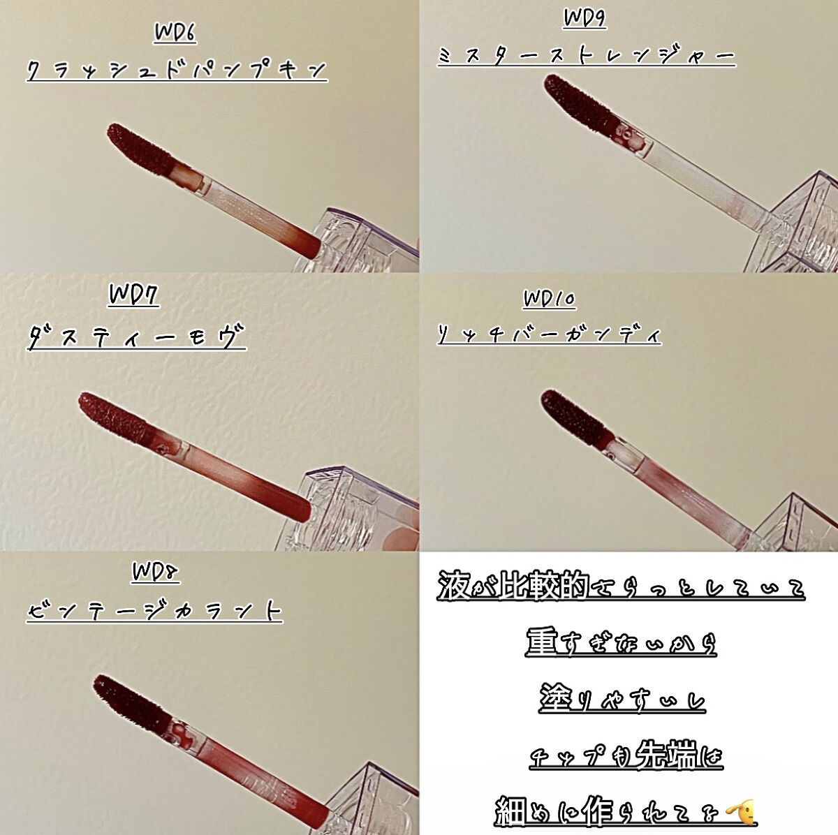 - <WD2 ビトゥン ローズ> 水、ジフェニルジメチコン、リンゴ酸ジイソステアリル、ビスジグリセリルポリアシルアジペート-2、水添ポリイソブテン、ジグリセリン、DPG、セチルPEG/PPG-10/1ジメチコン、イソステアリン酸ソルビタン、ポリソルベート60、ペンチレングリコール、オクチルドデカノール、セテアレス-20、(アクリル酸ヒドロキシエチル/アクリロイルジメチルタウリンNa)コポリマー、スクワラン、フェノキシエタノール、ポリグリセリン-3、ステビオシド、香料、エチルヘキシルグリセリン、グリセリン、シア脂、ツバキ種子油、トリ(カプリル酸/カプリン酸)グリセリル、アルガニアスピノサ核油、ホホバ種子油、アーモンド油、アンズ核油、月見草油、オリーブ果実油、テトラ(ジ-t-ブチルヒドロキシヒドロケイヒ酸)ペンタエリスリチル、カニナバラ果実エキス、マンゴー果実エキス、赤104(1)、赤227、黄5、青1 <WD3 ピンク ヘイズ> 水、ジフェニルジメチコン、リンゴ酸ジイソステアリル、ビスジグリセリルポリアシルアジペート-2、水添ポリイソブテン、ジグリセリン、DPG、セチルPEG/PPG-10/1ジメチコン、イソステアリン酸ソルビタン、ポリソルベート60、ペンチレングリコール、オクチルドデカノール、セテアレス-20、(アクリル酸ヒドロキシエチル/アクリロイルジメチルタウリンNa)コポリマー、スクワラン、フェノキシエタノール、ポリグリセリン-3、ステビオシド、香料、エチルヘキシルグリセリン、グリセリン、水酸化Al、ポリアクリル酸アンモニウム、BG、アルガニアスピノサ核油、シア脂、ツバキ種子油、トリ(カプリル酸/カプリン酸)グリセリル、アーモンド油、アンズ核油、ホホバ種子油、月見草油、オリーブ果実油、テトラ(ジ-t-ブチルヒドロキシヒドロケイヒ酸)ペンタエリスリチル、マンゴー果実エキス、カニナバラ果実エキス、酸化チタン、赤104(1)、赤227、黄5、青1 <WD4 オールウェイズ ヤング> 水、ジフェニルジメチコン、リンゴ酸ジイソステアリル、ビスジグリセリルポリアシルアジペート-2、水添ポリイソブテン、ジグリセリン、DPG、セチルPEG/PPG-10/1ジメチコン、イソステアリン酸ソルビタン、ポリソルベート60、ペンチレングリコール、オクチルドデカノール、セテアレス-20、(アクリル酸ヒドロキシエチル/アクリロイルジメチルタウリンNa)コポリマー、スクワラン、フェノキシエタノール、ポリグリセリン-3、ステビオシド、香料、エチルヘキシルグリセリン、グリセリン、シア脂、ツバキ種子油、トリ(カプリル酸/カプリン酸)グリセリル、アルガニアスピノサ核油、ホホバ種子油、アーモンド油、アンズ核油、月見草油、オリーブ果実油、テトラ(ジ-t-ブチルヒドロキシヒドロケイヒ酸)ペンタエリスリチル、カニナバラ果実エキス、マンゴー果実エキス、赤104(1)、赤227、黄5、青1 <WD6 クラッシュド パンプキン> 水、水添ポリイソブテン、リンゴ酸ジイソステアリル、ビスジグリセリルポリアシルアジペート-2、ジフェニルシロキシフェニルトリメチコン、ジフェニルジメチコン、ポリグリセリン-3、オクチルドデカノール、ポリソルベート60、セチルPEG/PPG-10/1ジメチコン、ラウリン酸ポリグリセリル-10、ペンチレングリコール、1,2-ヘキサンジオール、(アクリル酸ヒドロキシエチル/アクリロイルジメチルタウリンNa)コポリマー、PEG-60水添ヒマシ油、セテアリルアルコール、スクワラン、キシリトール、エチルヘキシルグリセリン、香料、ポリアクリル酸アンモニウム、イソステアリン酸ソルビタン、水酸化Al、フェノキシエタノール、BG、トコフェロール、酸化チタン、酸化鉄、赤227、黄4、黄5、青1 <WD8 ビンテージ カラント> 水、水添ポリイソブテン、リンゴ酸ジイソステアリル、ビスジグリセリルポリアシルアジペート-2、ジフェニルシロキシフェニルトリメチコン、ジフェニルジメチコン、オクチルドデカノール、ポリグリセリン-3、ポリソルベート60、セチルPEG/PPG-10/1ジメチコン、ラウリン酸ポリグリセリル-10、1,2-ヘキサンジオール、ペンチレングリコール、(アクリル酸ヒドロキシエチル/アクリロイルジメチルタウリンNa)コポリマー、PEG-60水添ヒマシ油、セテアリルアルコール、スクワラン、キシリトール、エチルヘキシルグリセリン、香料、イソステアリン酸ソルビタン、トコフェロール、赤104(1)、赤227、黄5、青1 <WD9 ミスター ストレンジャー> 水、水添ポリイソブテン、リンゴ酸ジイソステアリル、ビスジグリセリルポリアシルアジペート-2、ジフェニルシロキシフェニルトリメチコン、ジフェニルジメチコン、オクチルドデカノール、ポリグリセリン-3、ポリソルベート60、セチルPEG/PPG-10/1ジメチコン、ラウリン酸ポリグリセリル-10、1,2-ヘキサンジオール、ペンチレングリコール、(アクリル酸ヒドロキシエチル/アクリロイルジメチルタウリンNa)コポリマー、セテアリルアルコール、PEG-60水添ヒマシ油、スクワラン、キシリトール、エチルヘキシルグリセリン、香料、イソステアリン酸ソルビタン、水酸化Al、ポ