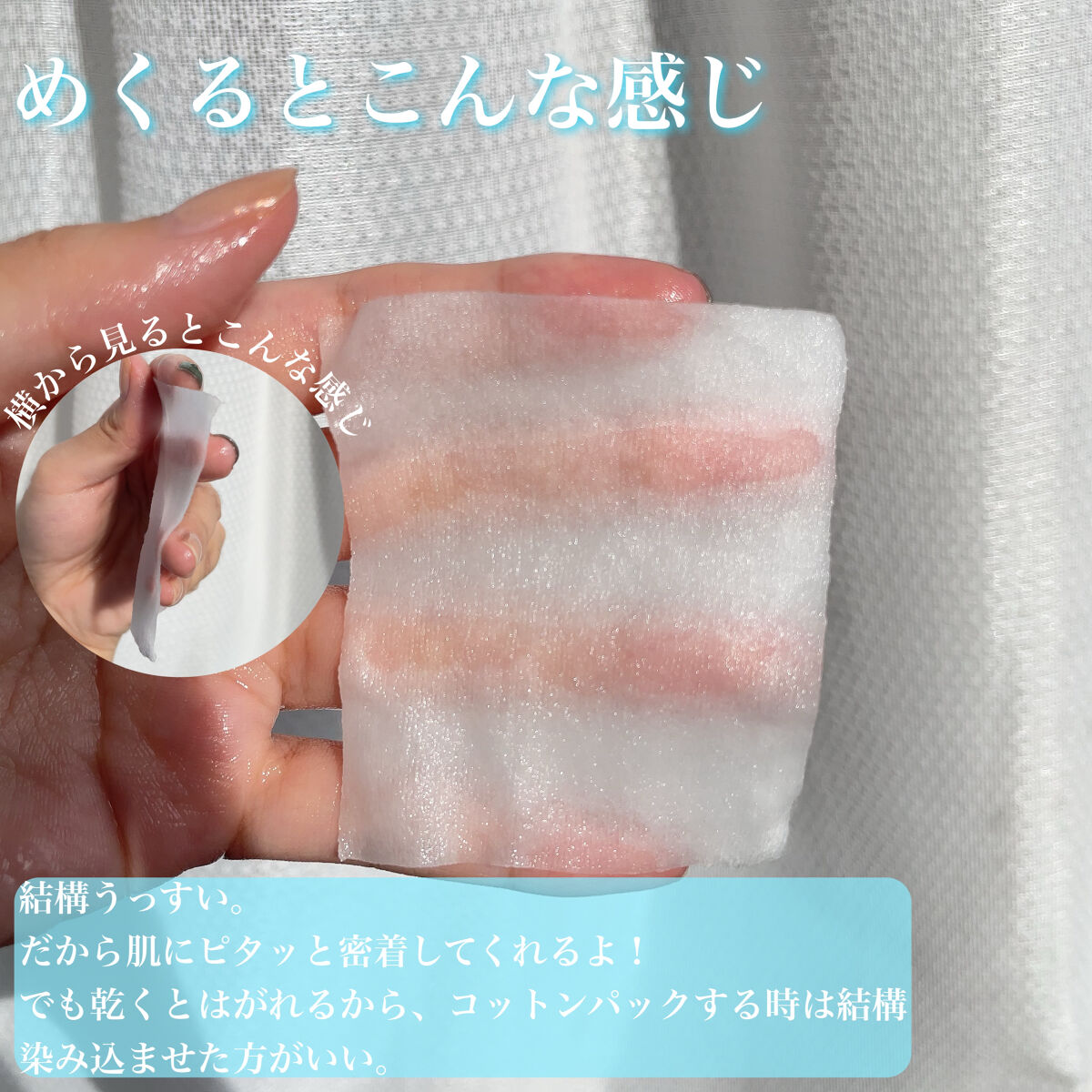 - パッティングの後にめくってパック。化粧水をムダにしない5枚重ねのコットンパフ。