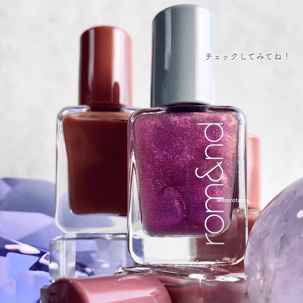 - 指先に玉石のような、ならかな光沢をとどめる。塗った瞬間から綺麗なツヤと光沢を維持し、重ねて塗っても透き通ったカラー感を鮮やかにとどめる、素早い乾燥力のナチュラルカラーネイル。「ロムアンド」の次世代型ネイルです。