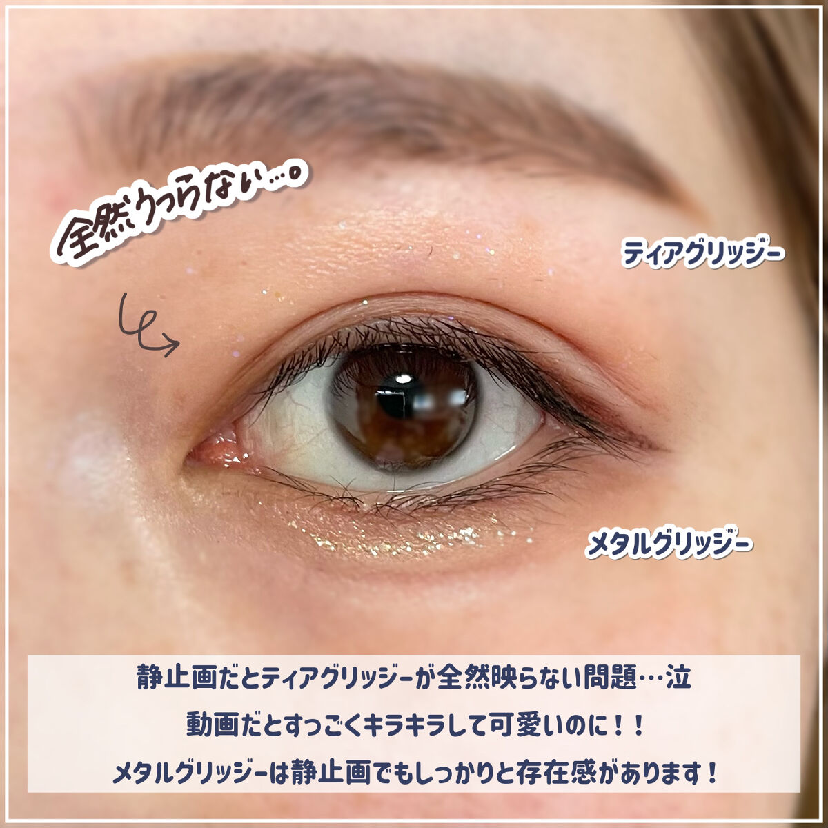 まず、一重・奥二重は二重よりも怖い印象を与えやすいです。 横長=細い=睨んでるという印象を持たれたことあるのは私だけではないはず😖 一重・奥二重の人は 【優しい印象】になるメイクを心がけるのが大事だと思います。 アイライナー・マスカラは【茶色系】がおすすめ。 引き方は【斜め下】に。 アイシャドウは基本的に何色でもいいと思います。 グリッターは、上まぶたは細かいラメがおすすめ。 上にギラギラ系を使うとキツくなりがちなので控えるのがおすすめ😂 下まぶたは、好みに合わせてサイズは選んでいいと思います!! 大きい粒を乗せてもきつくなりにくいので存在感出したい場合は下まぶたに💗
