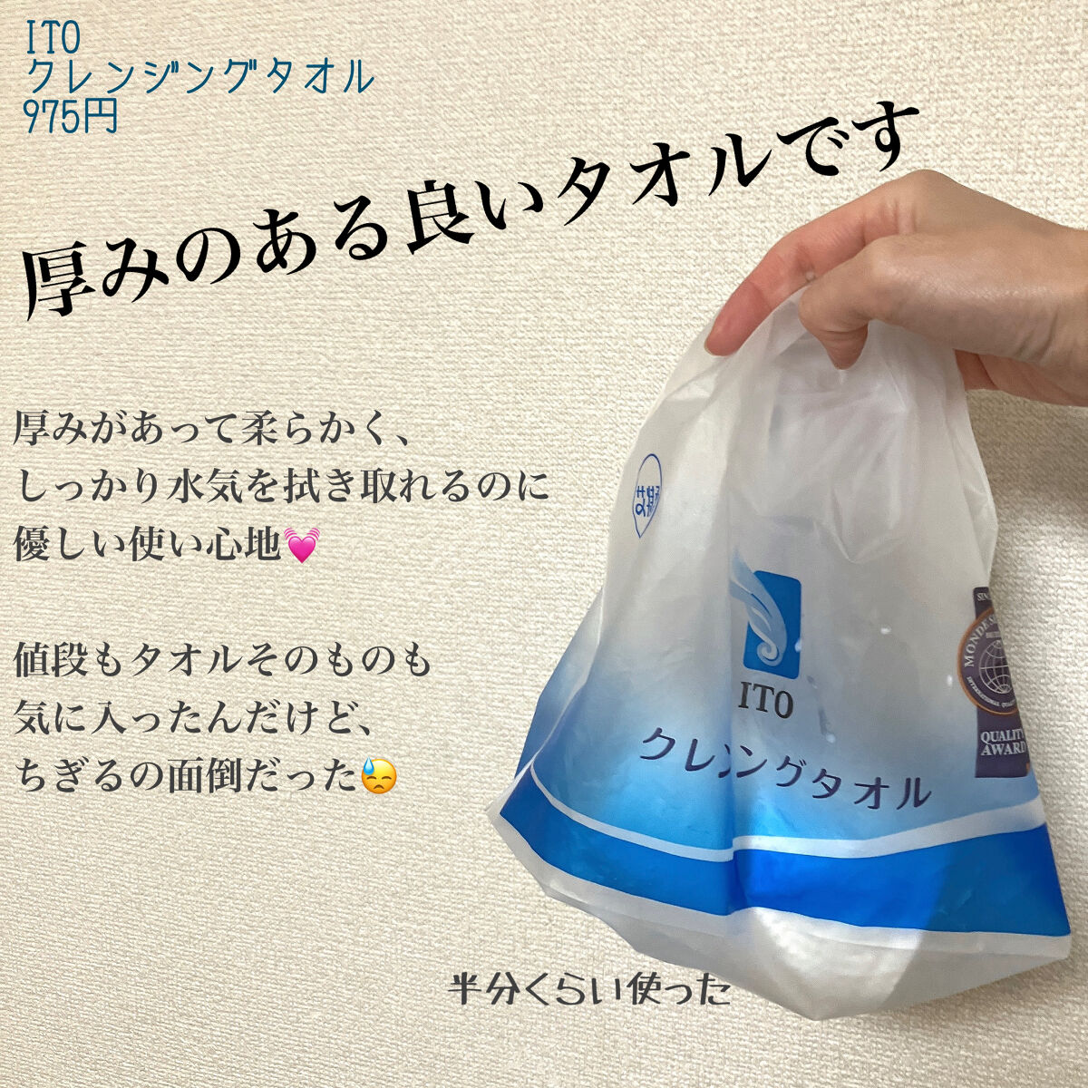 使い捨てタオルに変えてから、使い勝手が良すぎて、もう布には戻れない☺️ 自分で好きな長さでカットできて、クレンジングや洗顔の時だけでなく、全身を拭くときや汗拭きタオルなど、色々使える😁 結構しっかりした作りで、厚みもあるから、拭きやすいの。そしてやわらか🥰