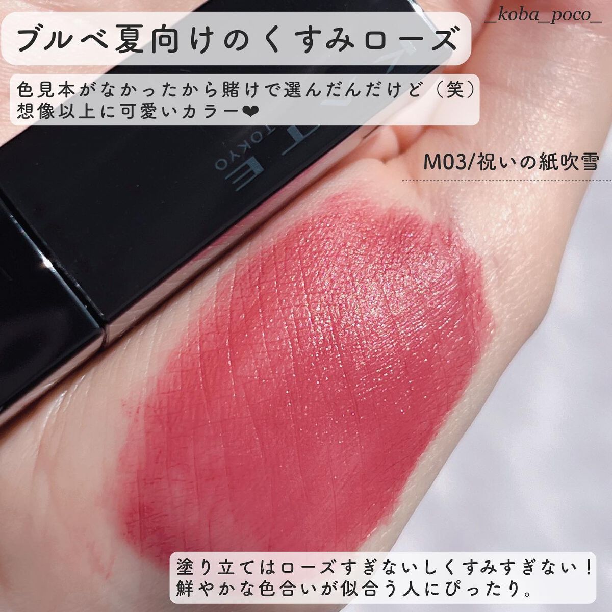 大人気のケイトのリップモンスターの、マットタイプのリップです! 高発色で、人塗りでも結構色づいてくれました! 塗りすぎ注意です! M03祝いの紙吹雪の色味は、赤系で、大人っぽい感じの色味が好きな方におすすめです!