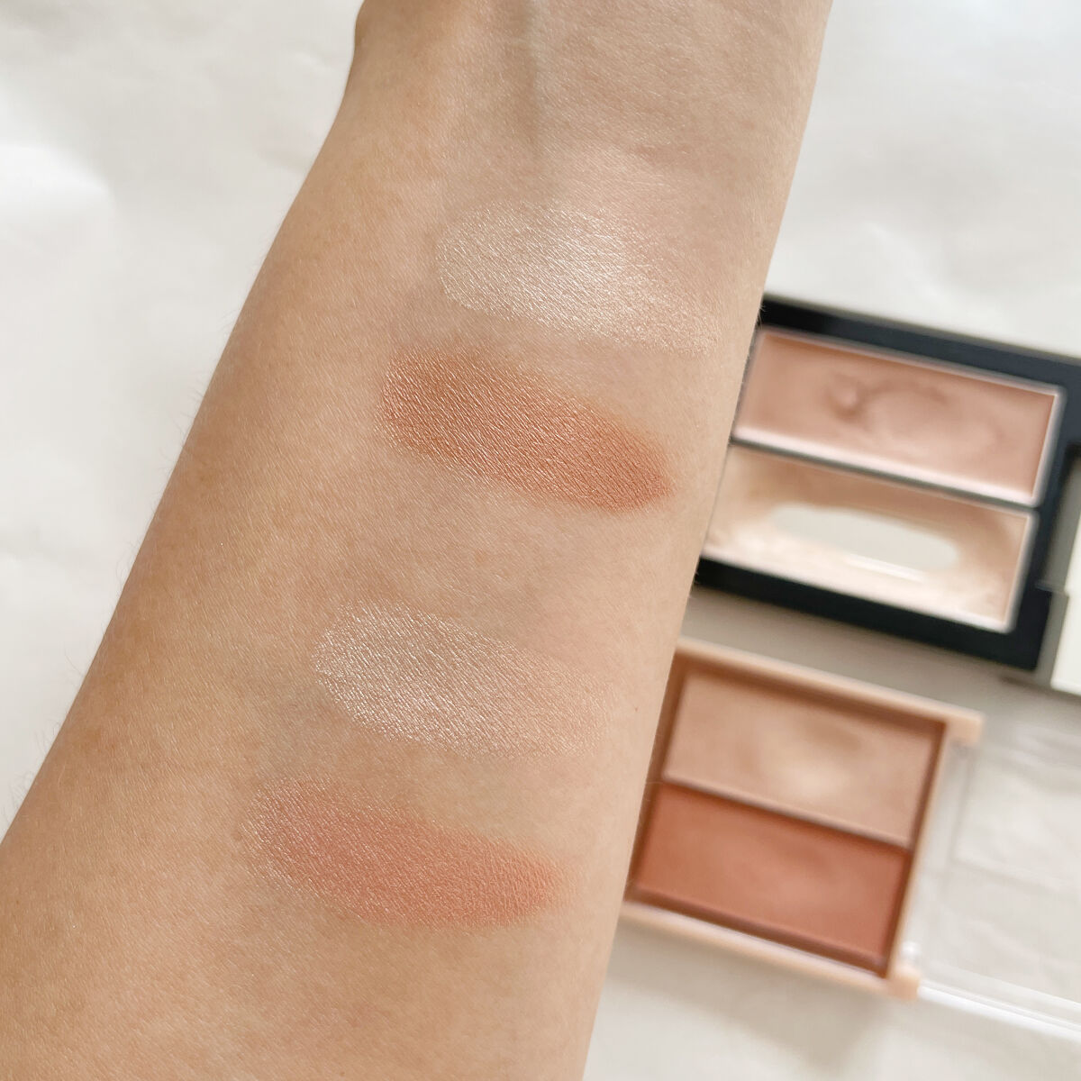 テクスチャーはクリームアイシャドウなので体温でジュワッと溶ける感じなのですが他社のクリームアイシャドウよりも柔らかめだなと感じました。 手で取ると少量でもすごく綺麗なラメ感が出るのでとにかくめちゃくちゃ可愛いです。 お肌に乗せた時の色と仕上がりにめちゃくちゃテンションが上がりました!ほんっっとに可愛いオレンジブラウン! 薄くのばして重ねてもあまりムラが気にならないのでパパッとメイクするときにも使えるしこれ単色でもすごく可愛い。 クリームアイシャドウの中ではまぶたの溝に溜まる量も少なめに感じました。もちろんほんのり溜まっちゃうんですがカラーのおかげもありあまり気にならないかな?という感じ。 カラーの可愛さに本当にびっくりしました。そしてクリームアイシャドウとしてもしっとり感と密着感のバランスが程よくてすごく使いやすく感じています。