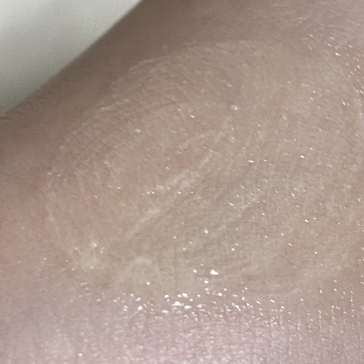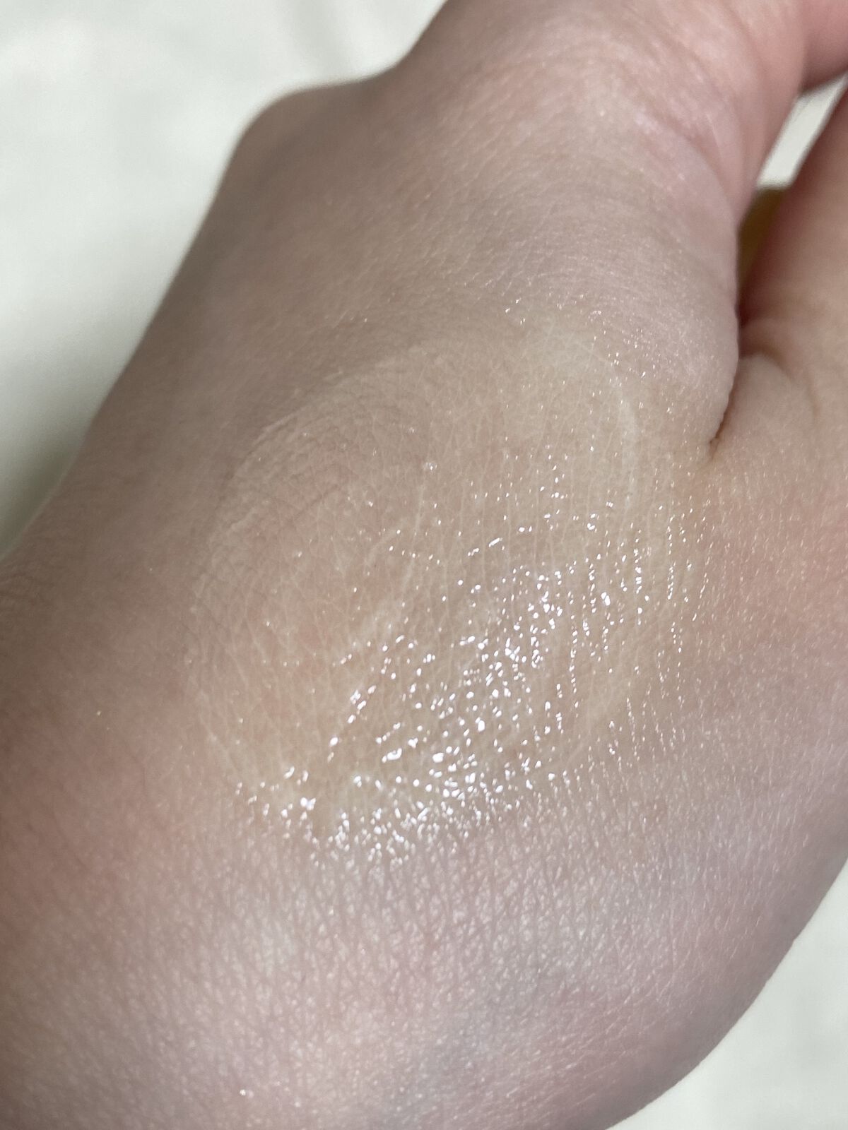 トーンアップするか否かの確認が漏れていて、無色透明のつもりで購入。開封時にパッケージを見てトーンアップやん!?!?となりました。しかしトーンアップと言っても艶で明るく見える程度の仕上がりで好みでした。 無色透明の方がベースメイク前に仕込むのに使いやすく、そのまま首やボディも塗れちゃうので手軽なんですよね。 塗りたては少しべたつくものの、時間が経つとベタつきは感じずしっとりとした触り心地に。