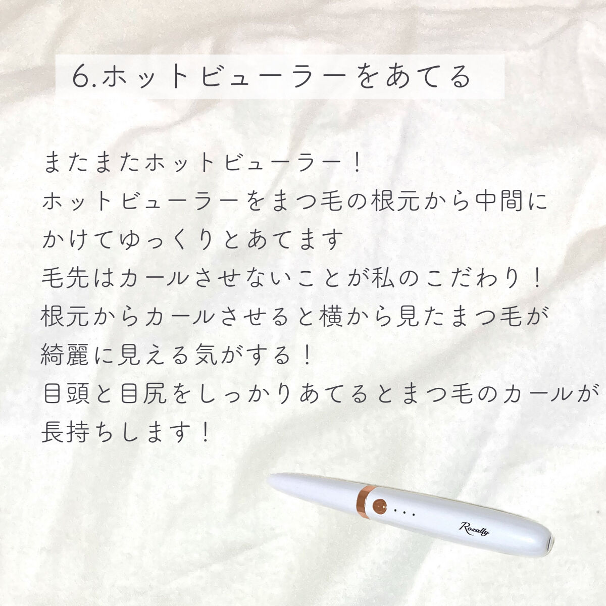 まつ毛美容液を塗ると、 まつ毛が長くなるだけじゃなく、カールしやすくなったり抜けにくくもなります。 まつ毛コームを使うと、着きすぎちゃった余分なマスカラも取れるし、ダマにならないし、綺麗に束感を調節できます。 最後にホットビューラーで整えます。手間かかるけど、ホットビューラー使うようになってから本当にまつ毛褒められる事が増えました。