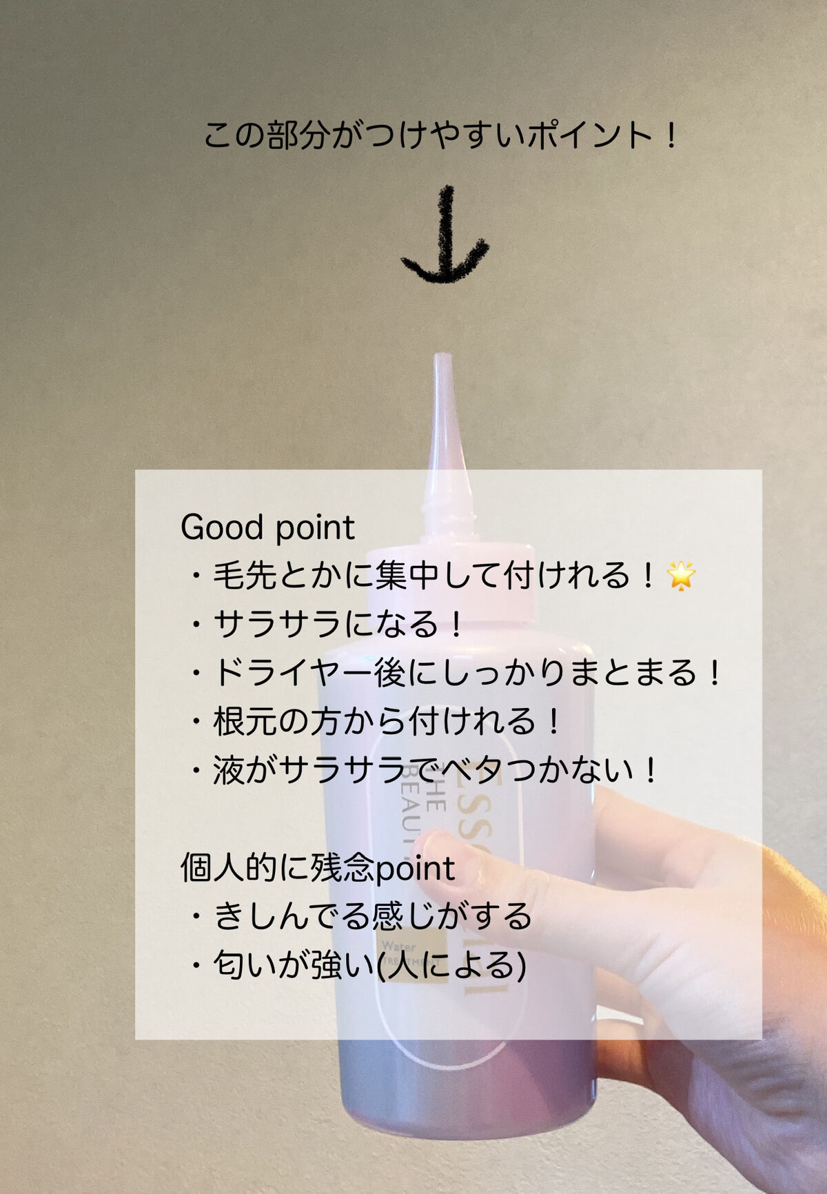 | ヘアケア・スタイリングランキング第22位 | 軽いとろみはありますが 重さはなく べたつかず サラっとなじませやすい ウォーターテクスチャー | 詳細を見る | |